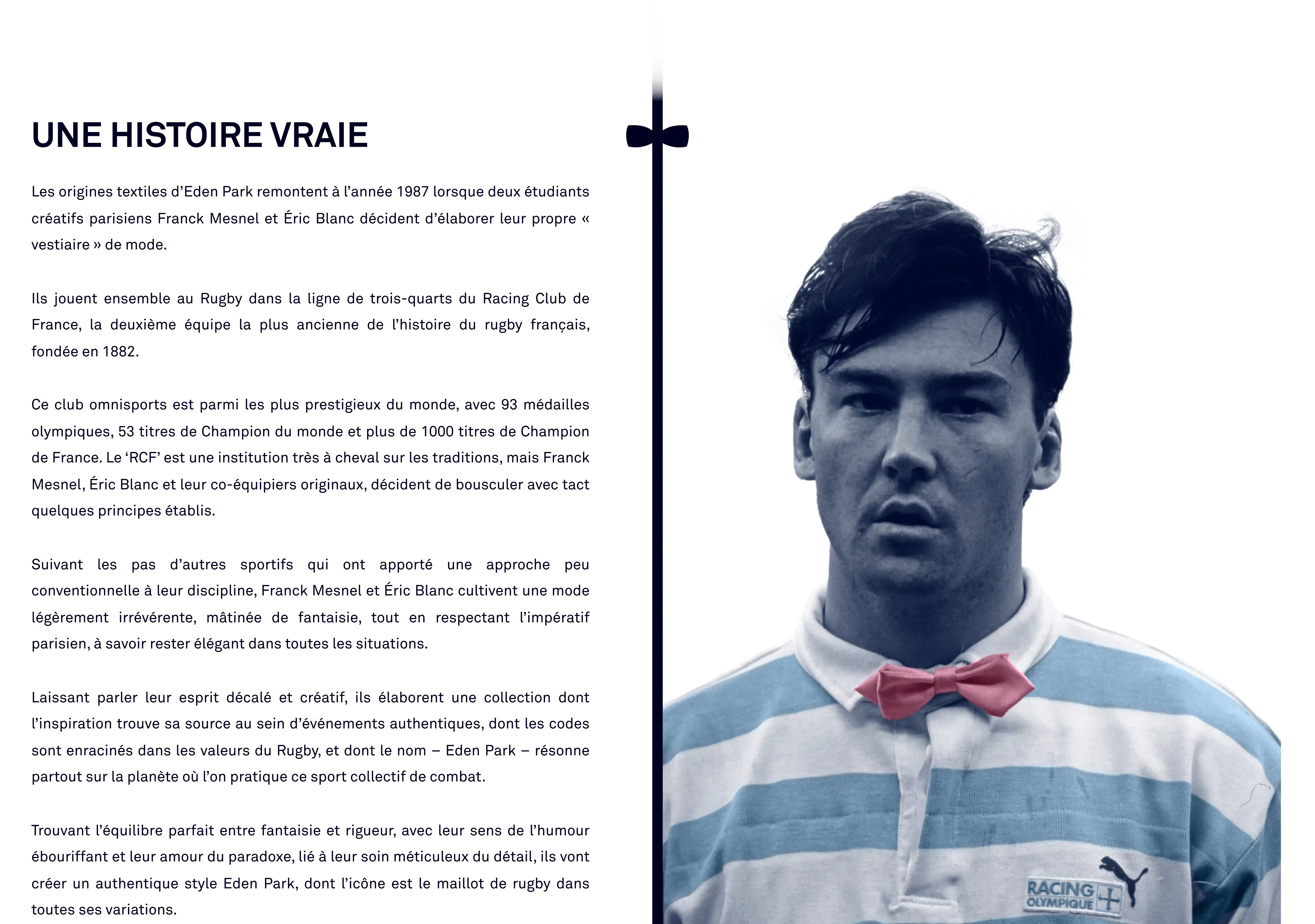 The remarkable story of a true Parisian brand, which began with an incredible and unique idea and went on to become a major player in the world of high-end fashion. An authentic story, born on the French rugby fields in the 1980s, a sparkling saga of a group of rugby players, including Franck Mesnel and Éric Blanc, with a creative and irreverent spirit. Eden Park is a premium brand which, since its dazzling debut at 194 rue de Courcelles in the 17th arrondissement of Paris, has established its high-quality, offbeat elegance, paving the way to become a family-owned business, controlled by its founders, international and thriving with 360 points of sale across 35 countries.