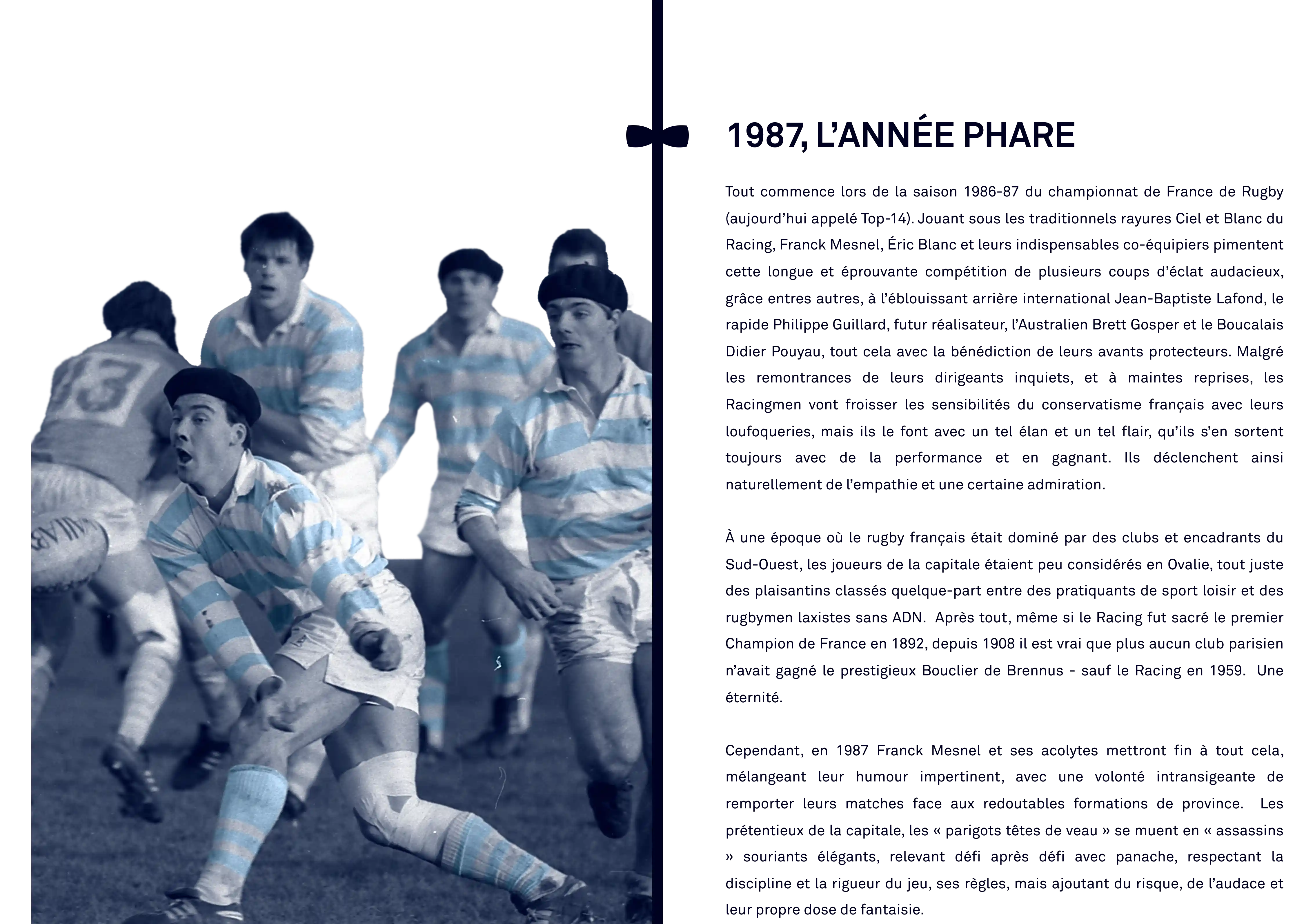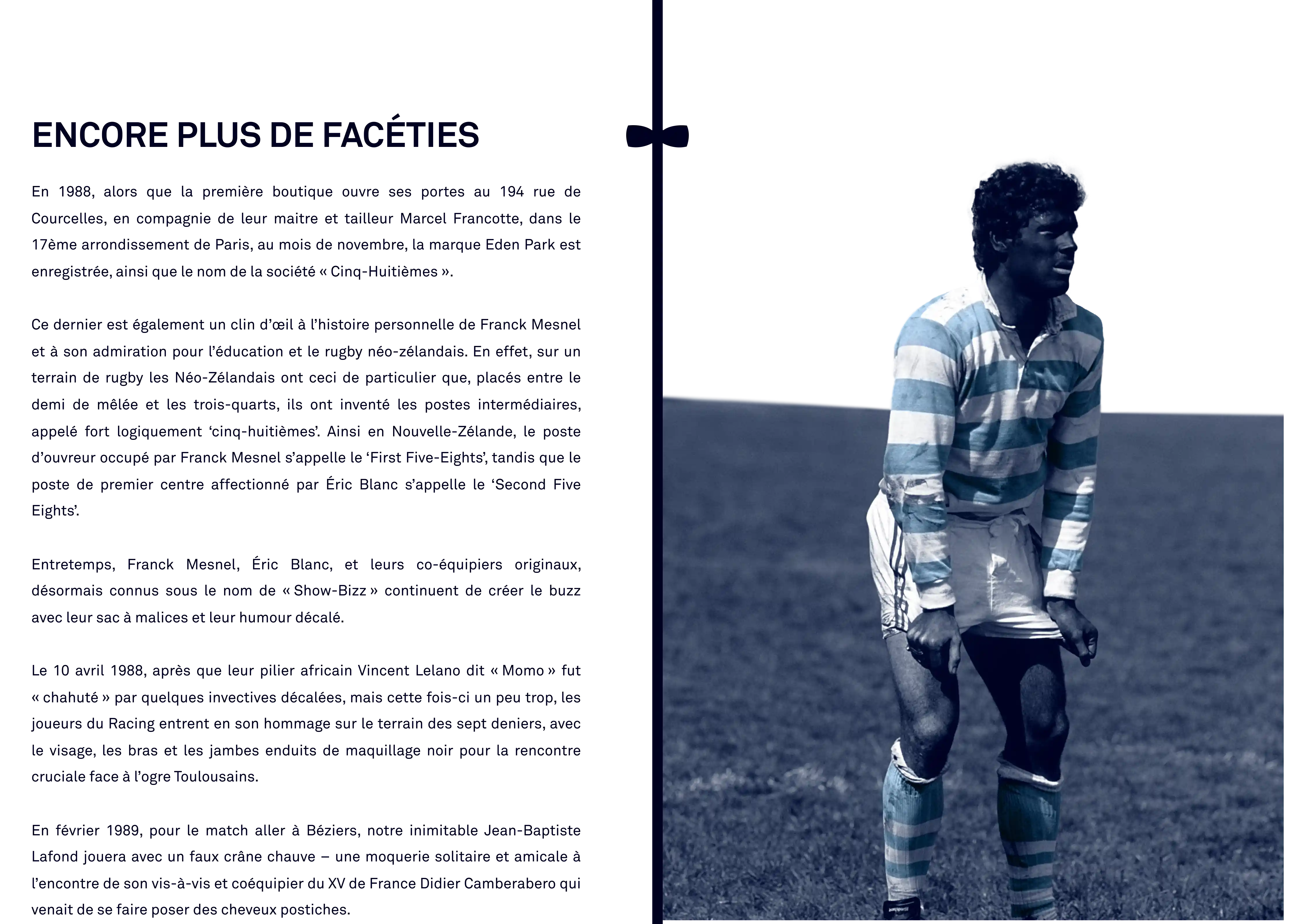 Tout comme le nom même d’Eden Park, cet élément et futur attribut de la marque provient d’événements authentiques, de facéties typiquement parisiennes perpétrées par Franck Mesnel et ses coéquipiers, plus particulièrement lors de deux finales du Championnat de France au Parc des Princes, en 1987 et 1990.