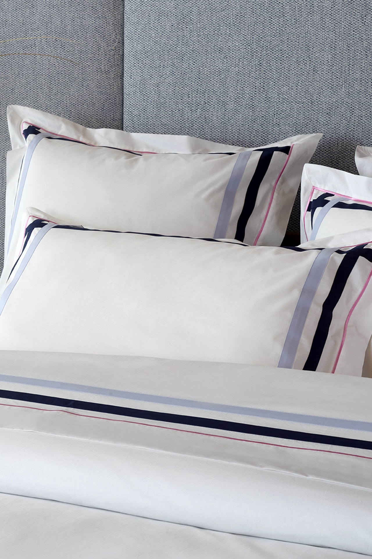Sure to be Eden Park's most iconic design, this duo of pillowcases features the colors of the famous cut-and-sew jersey: navy blue, sky blue, pink and white. Made from 200 threads/cm cotton percale2cotton percale, this range features colorful applied ribbons and Eden Park's signature navy blue embroidery. The pink mirror-embroidered bow tie is also a discreet signature on each pillowcase.