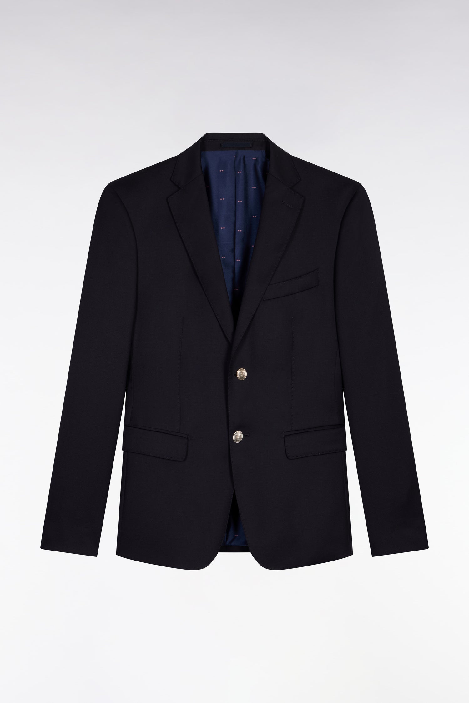 Elegant, this blazer has a slim fit that enhances the silhouette. The contrasting satin canvas lining is printed with the iconic pink bow tie.