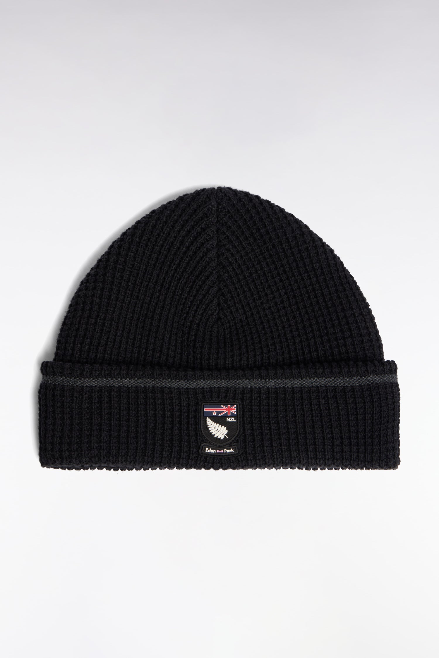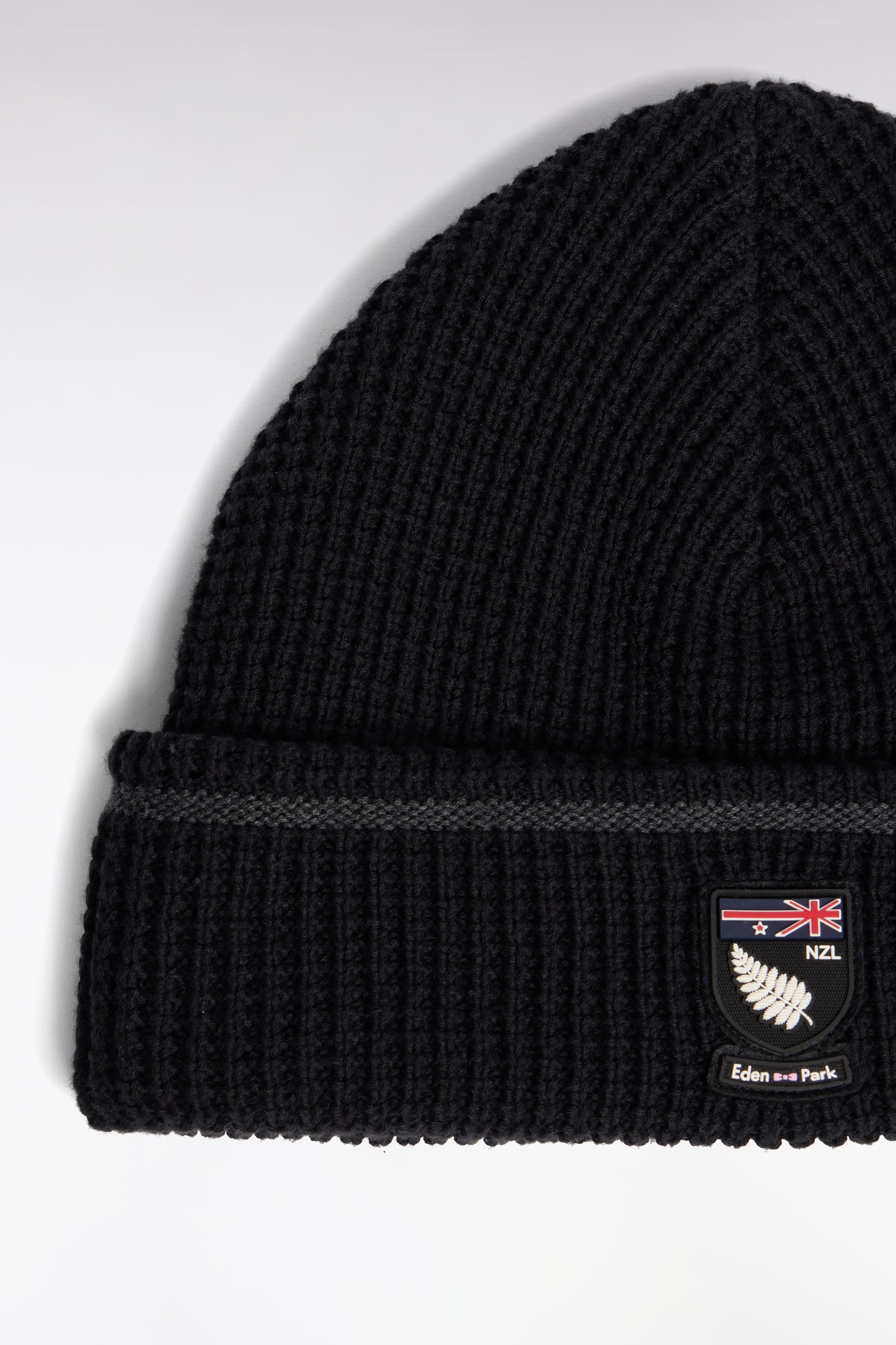 This black ribbed knit lapel hat with gray braided trim is made from a dense, soft-touch knit. It is discreetly adorned with an embroidered New Zealand crest. A graphic, timeless accessory designed to warm up your winter silhouettes with a sporty twist.