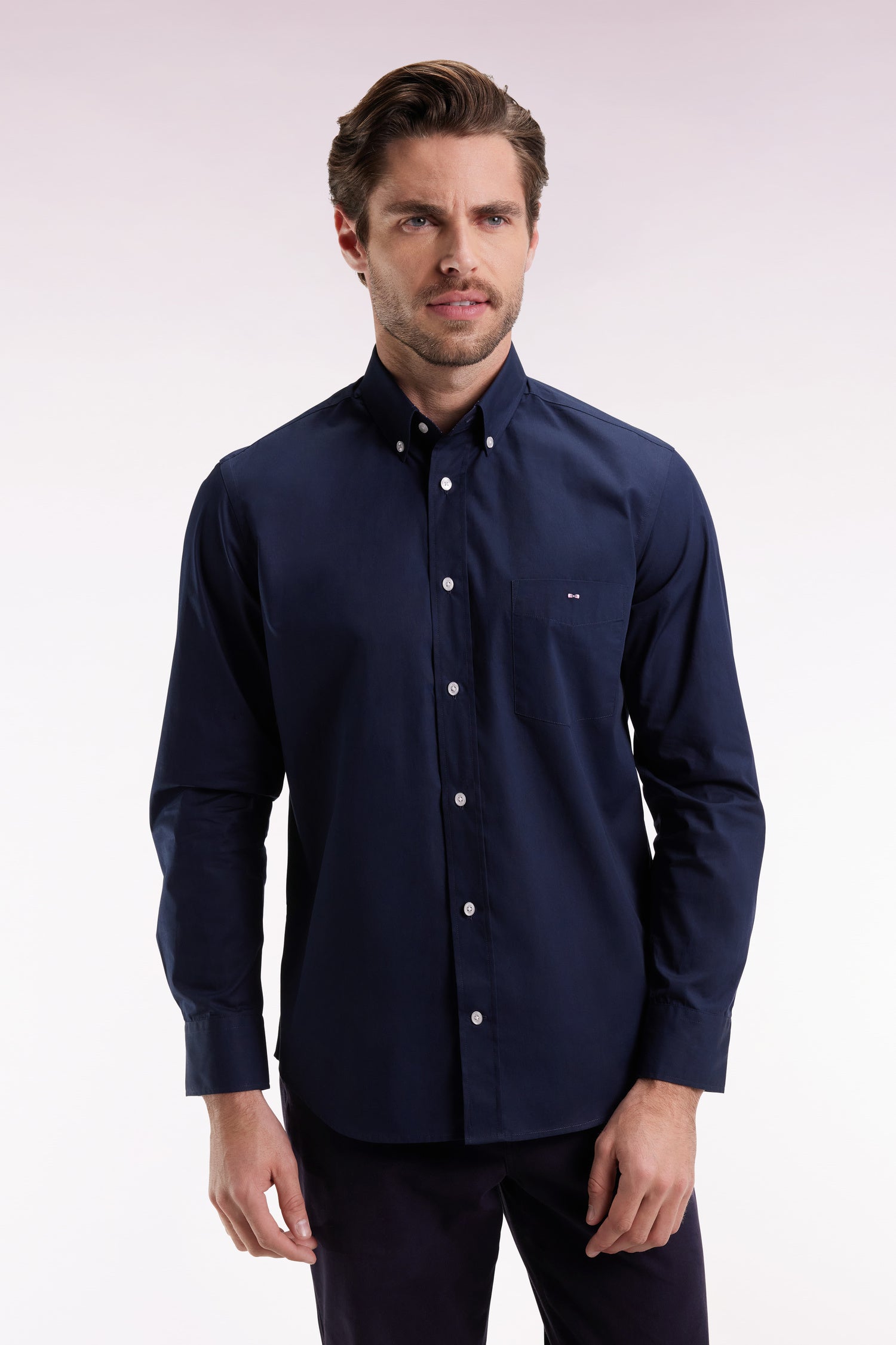 Behind its streamlined look, this elegant cotton poplin shirt hides a playful wink that Eden Park wardrobe insiders will recognize. The House emblem, the bow tie, is concealed in a micro-patterned print on the inside of the collar and worked into blue elbow patches. An elegant shirt with a straight cut, twisted with contrasting finishes that underline its French Flair spirit. This timeless, original model is available in sky, navy or white cotton, and always features a button-down collar for extra hold.