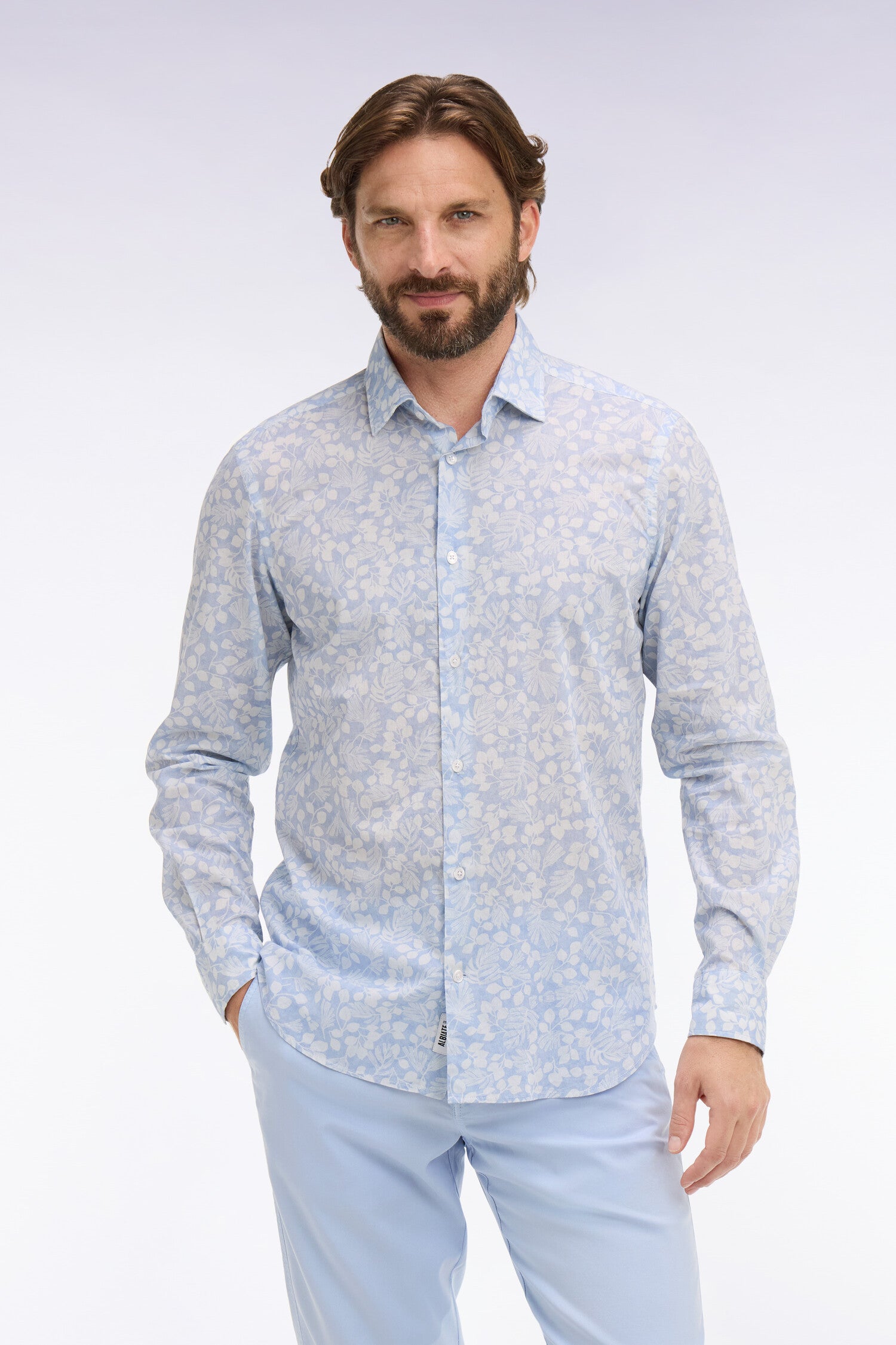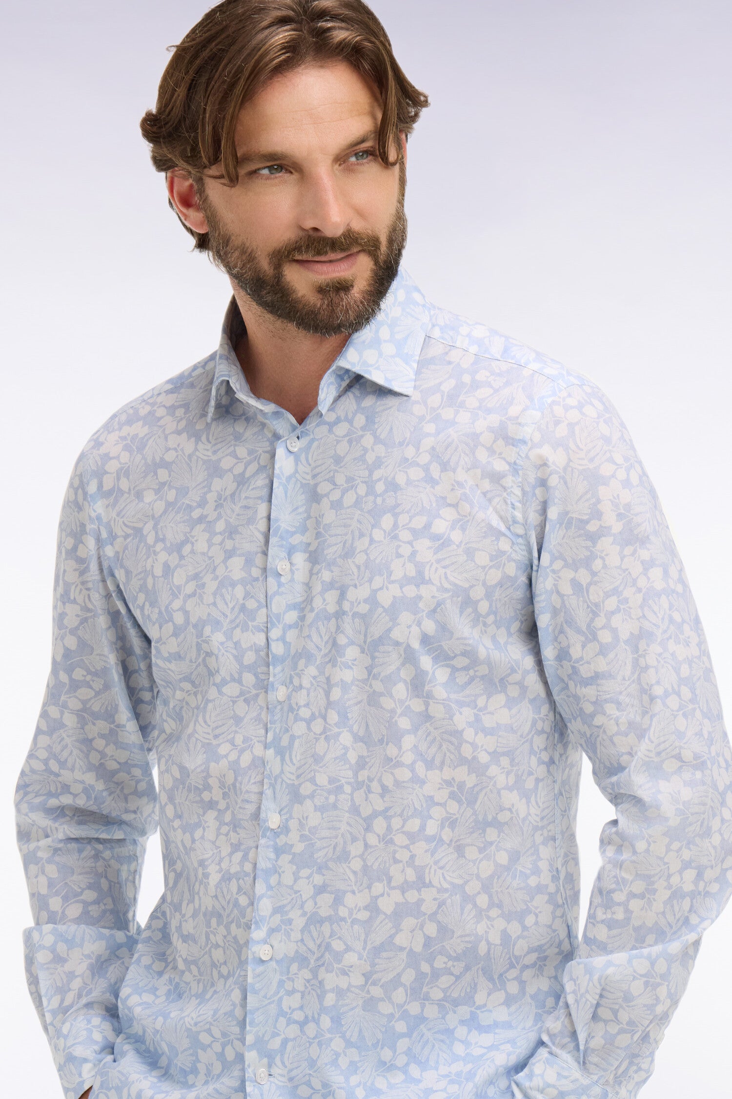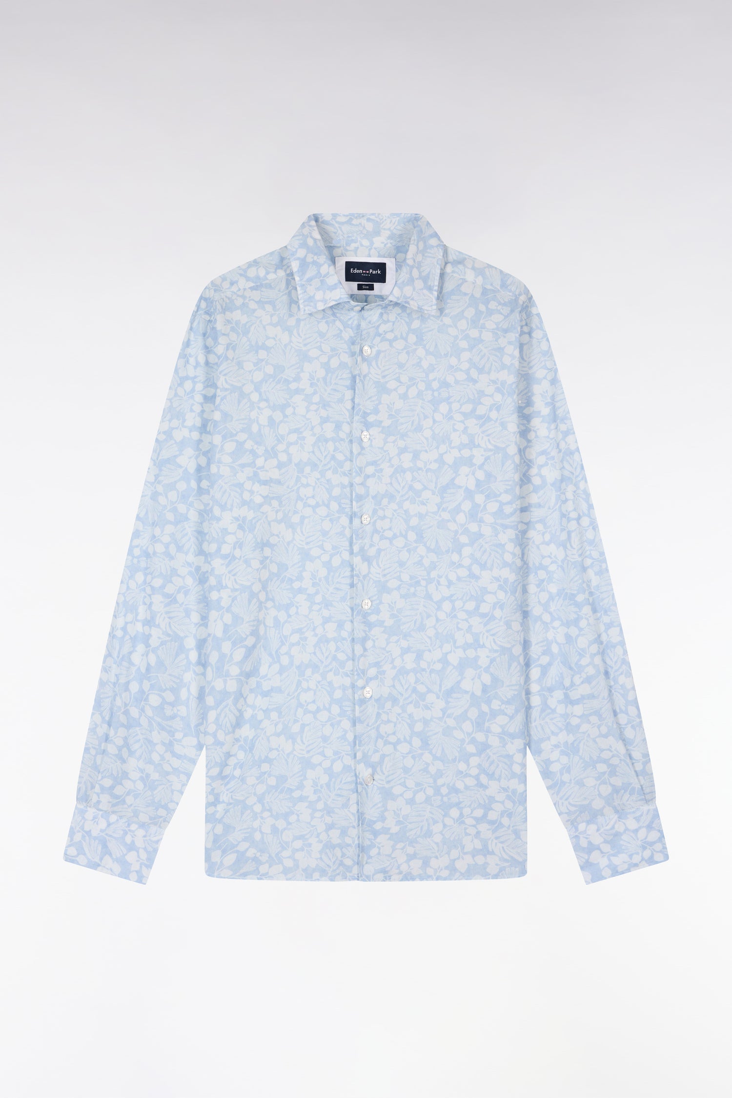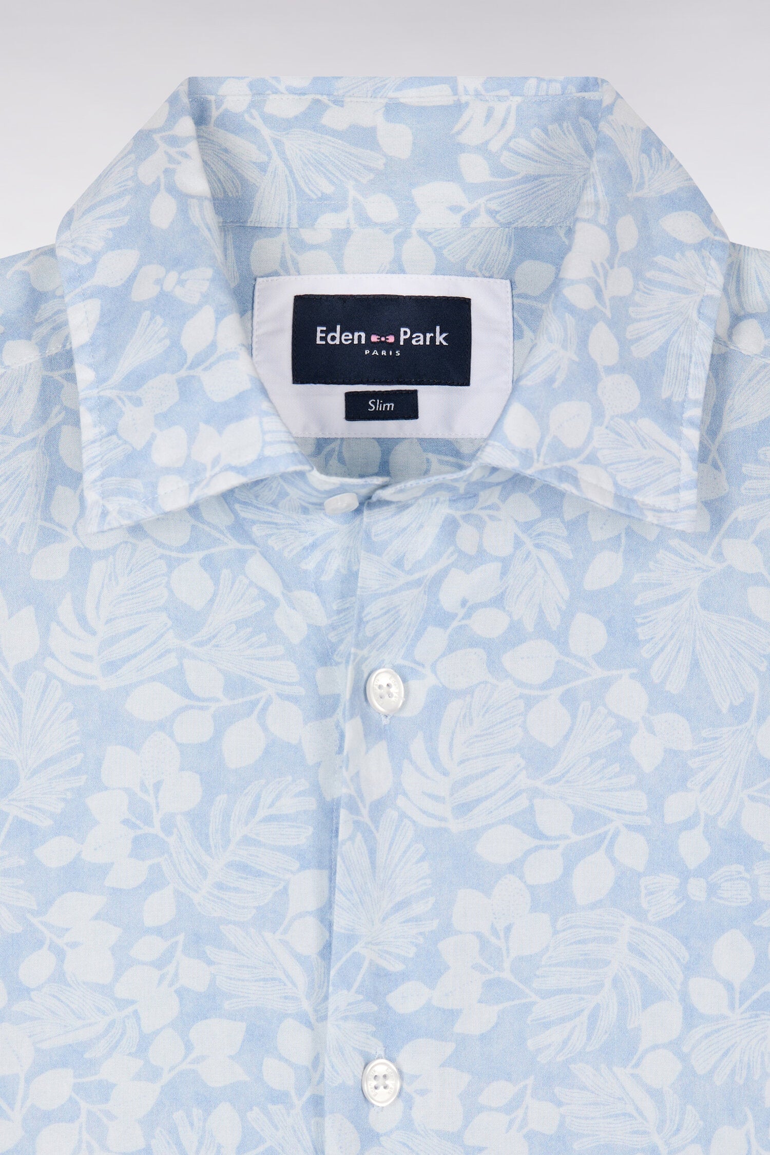 Chemise en popeline de coton bleu ciel à micromotifs végétal coupe slim