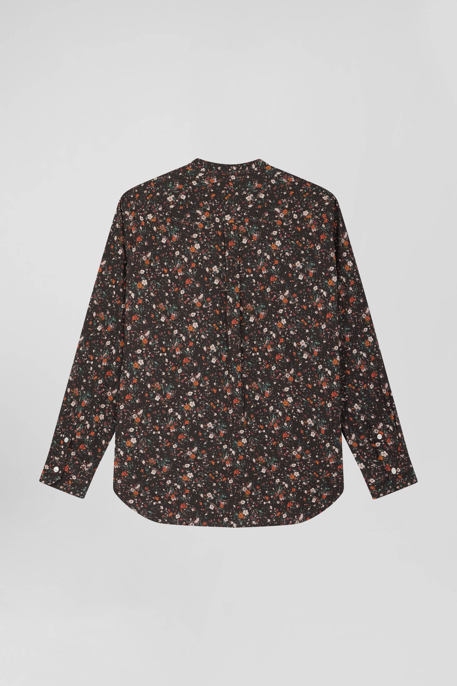 Regular collarless black floral microprinted cotton poplin shirt