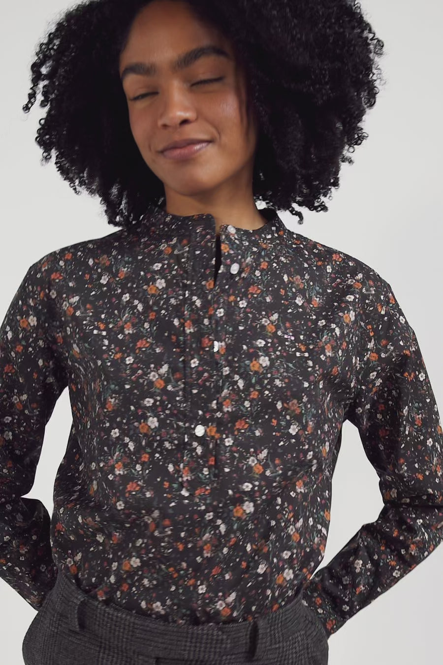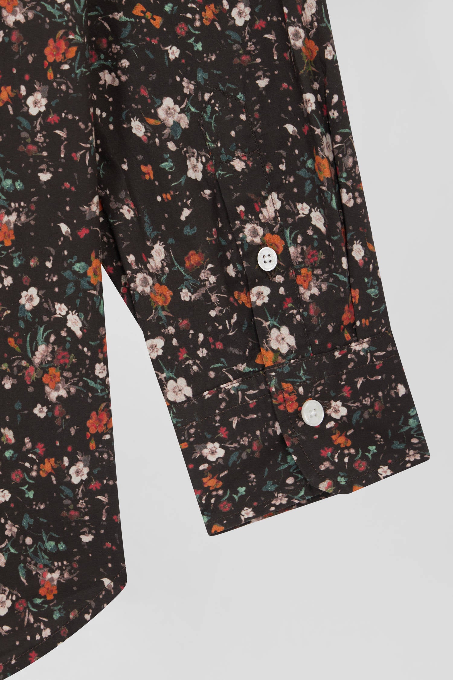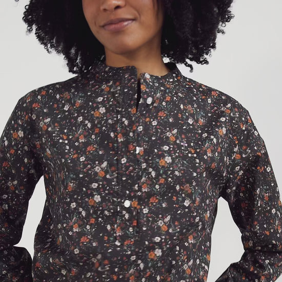 This feminine, poetic shirt is made from a light, soft cotton poplin. Its floral micro-pattern, designed exclusively for our Maison, adds a romantic, modern touch with its play of contrasts. Its straight cut and lack of collar enhance the head and silhouette. For a feminine autumn-winter outfit, why not match this shirt with our beige corduroy suit?