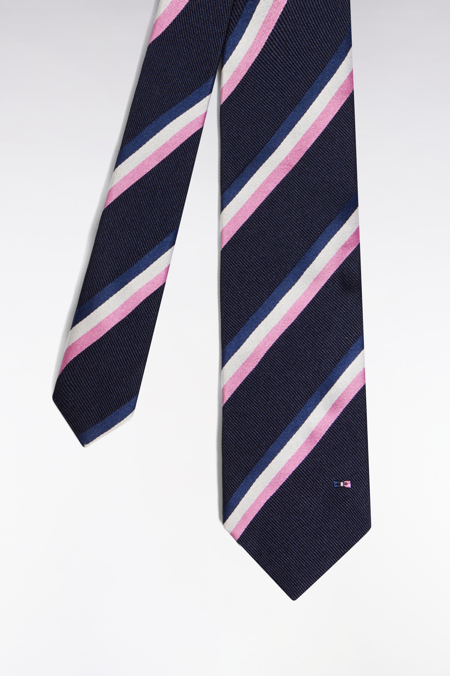Elegant and resolutely French, this navy tie is distinguished by its tricolored bias stripes. A dynamic, structured pattern that revisits the rugby chic spirit emblematic of our fashion house.