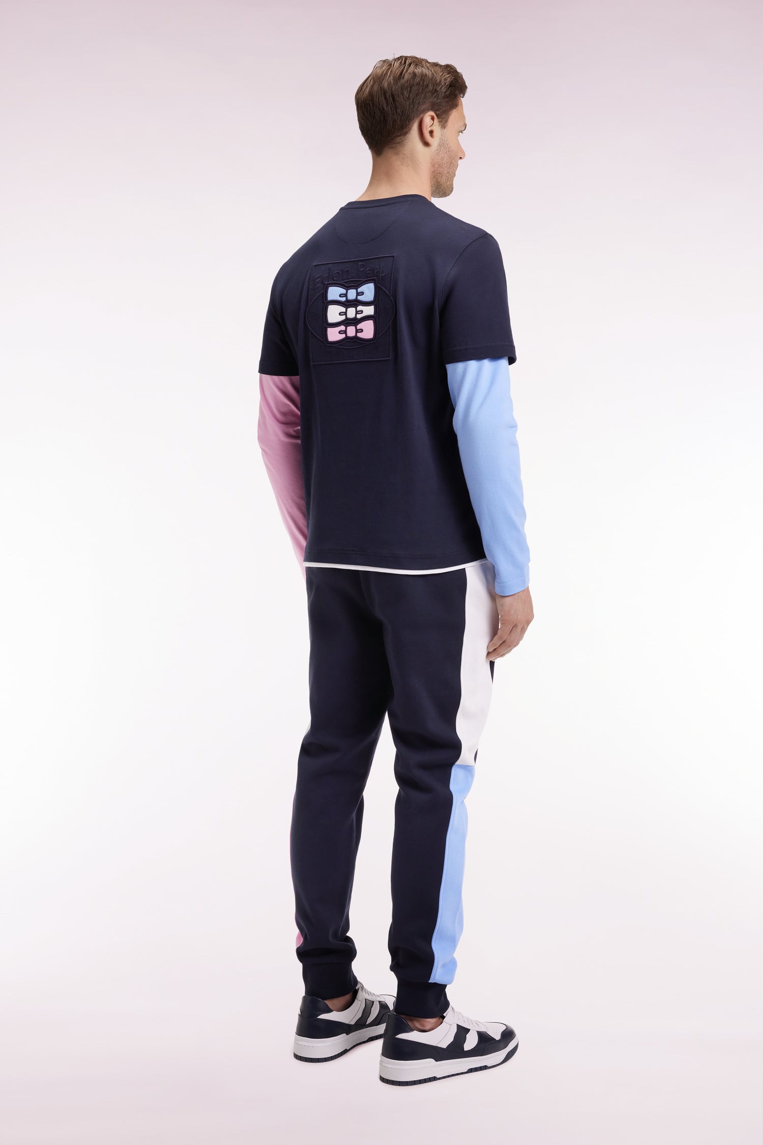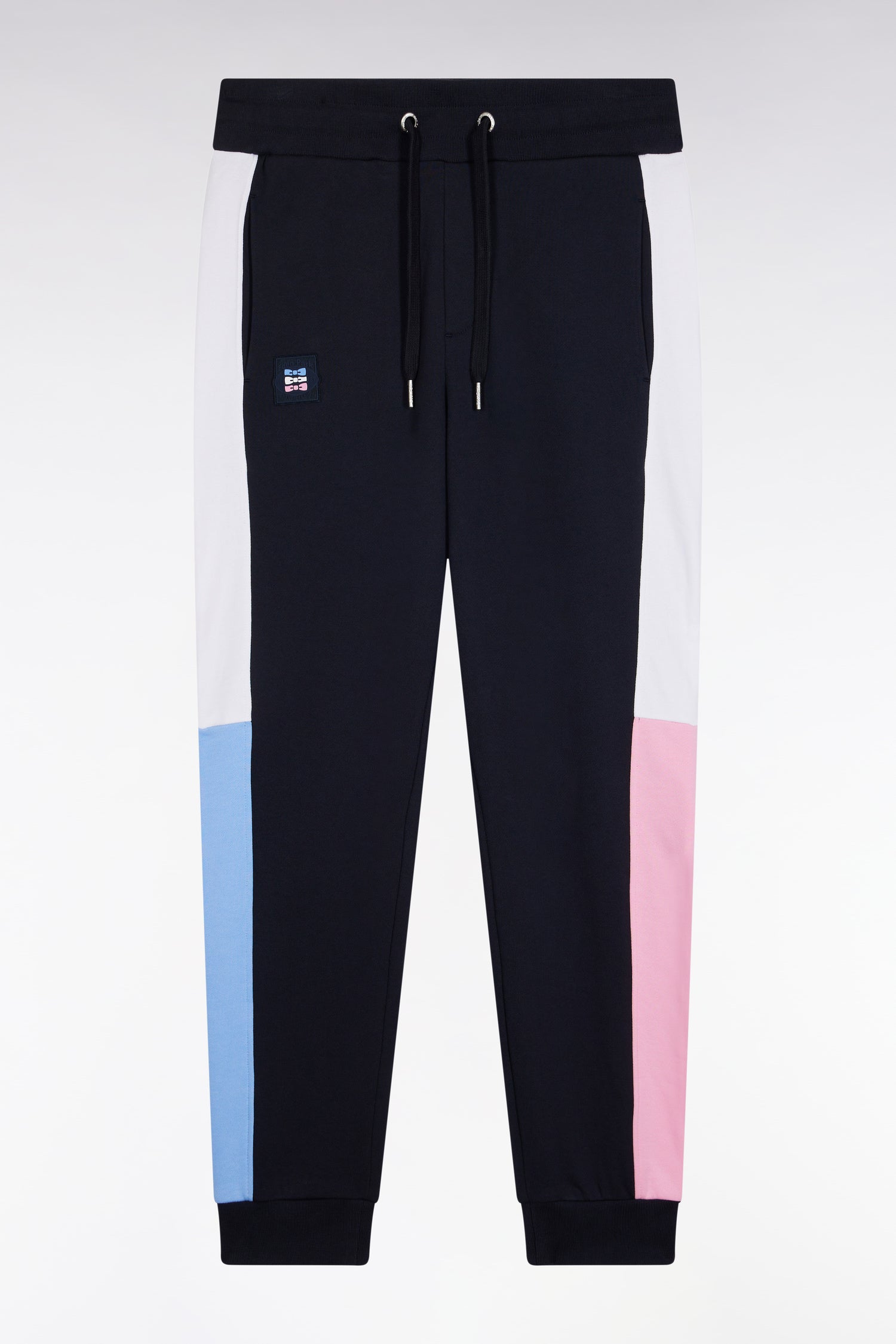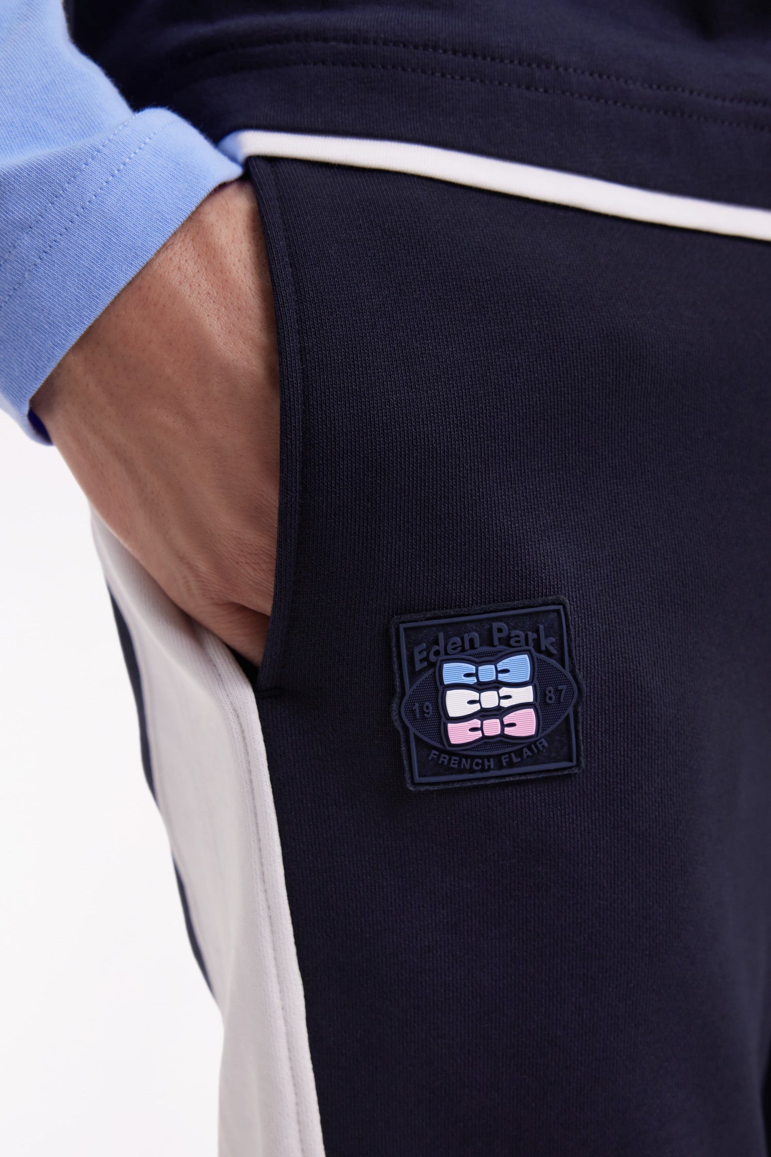 These men's cotton fleece joggers feature contrasting stripes down the legs for a graphic touch, reminiscent of Eden Park's signature colorblock combinations. Ideal for pairing with a matching sweatshirt, jersey or T-shirt for a sporty-chic silhouette. Available in black or navy, with contrasting stripes in shades of gray and ecru or pink and sky.