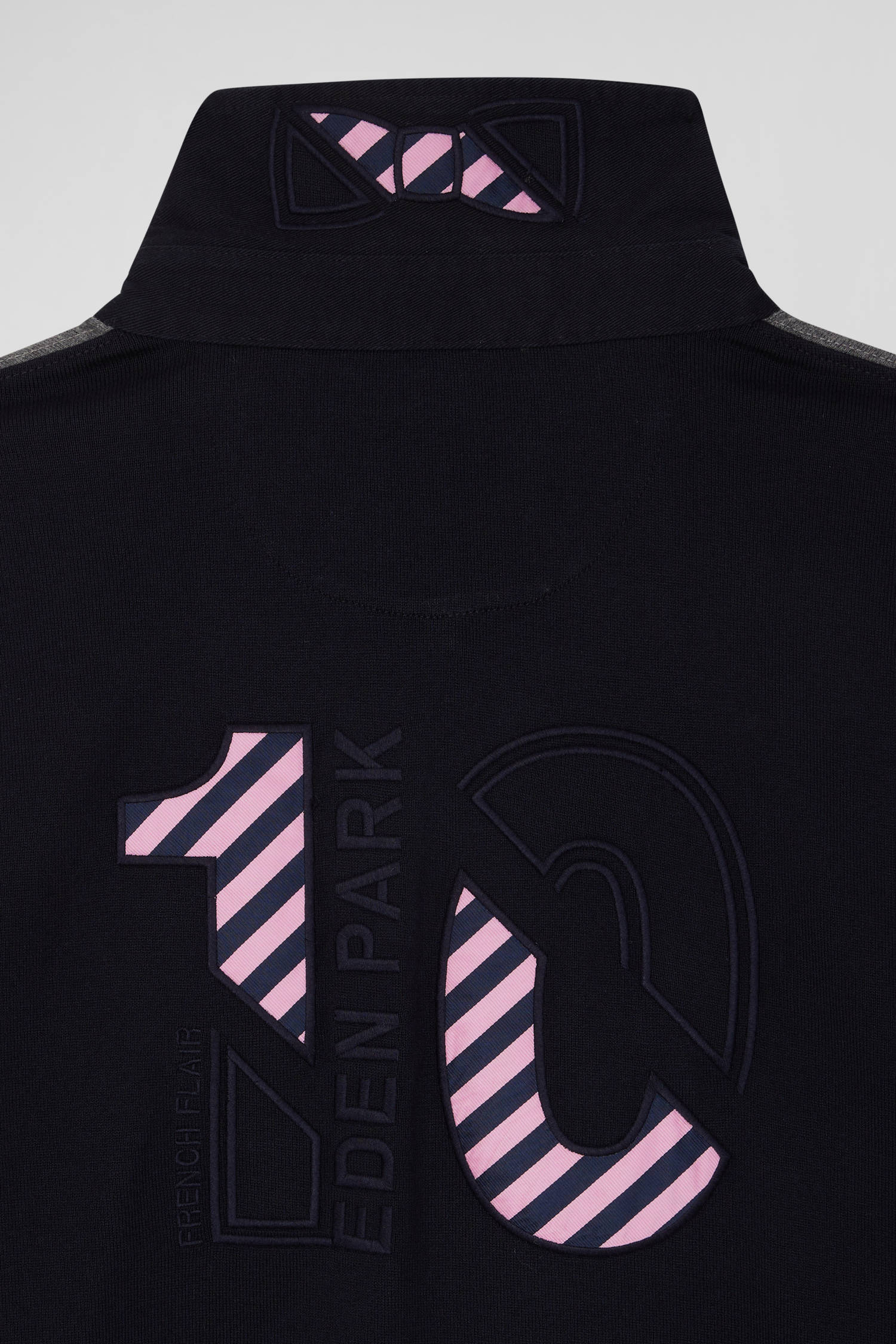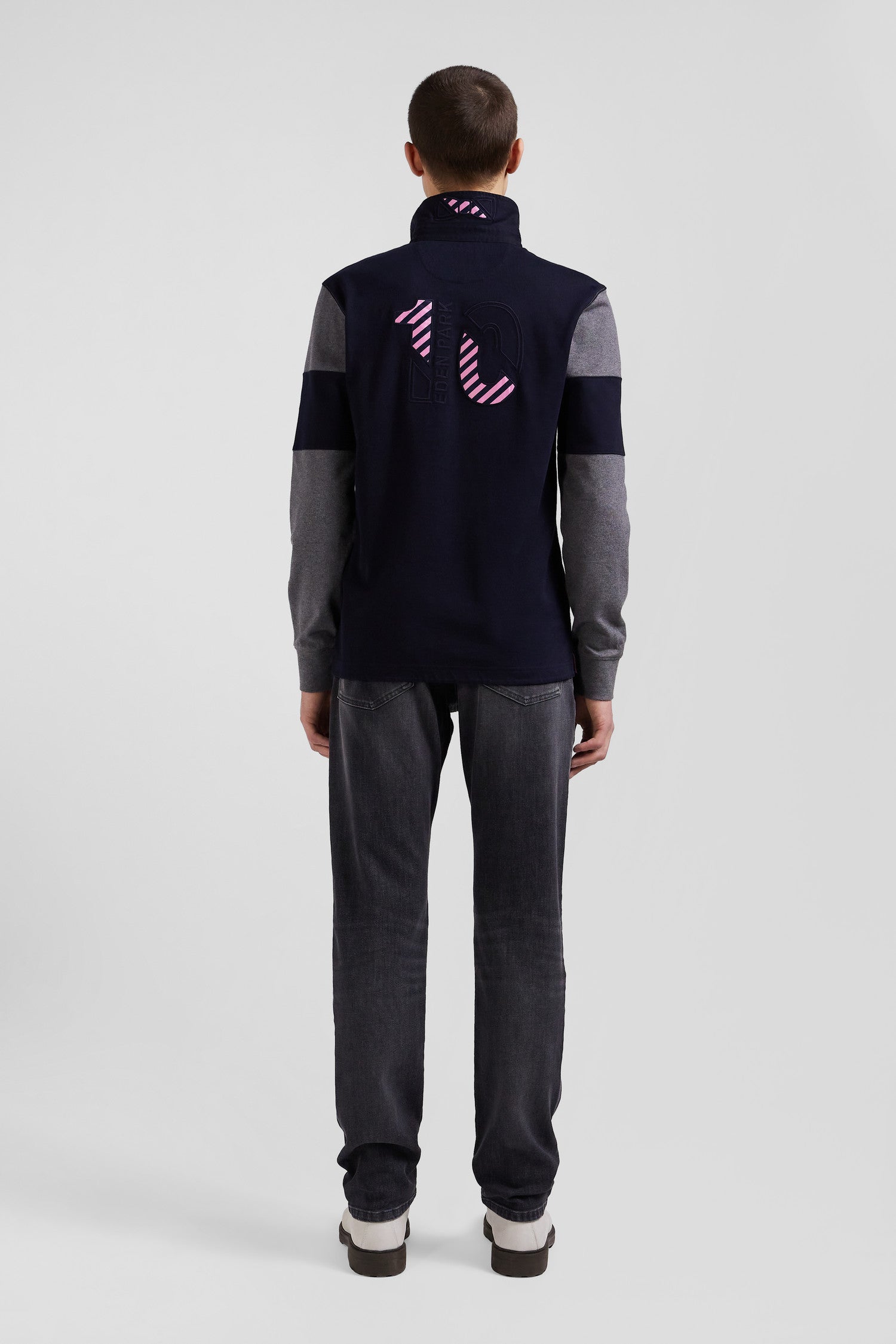 Make a style statement with this Eden Park long-sleeved men's jersey. Sporting elegance is reinvented in a colorblock tribute to the iconic colors of our House. The bold embroidery of the number 10 on the back, highlighted by hooped tie fabric, celebrates rugby heritage with panache. The classic collar, contrasting button placket and iconic embroidered bow tie give this characterful piece a distinguished finish.