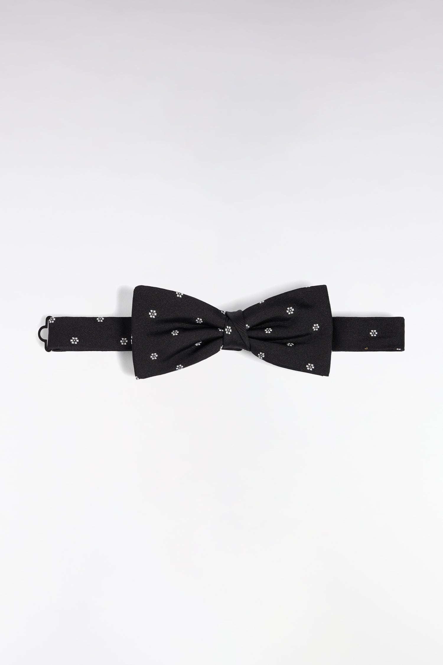 This black silk bow tie is adorned with white floral motifs for a discreet touch of refinement. Already tied and featuring an adjustable collar, it adapts to all silhouettes to sublimate a suit or formal shirt.