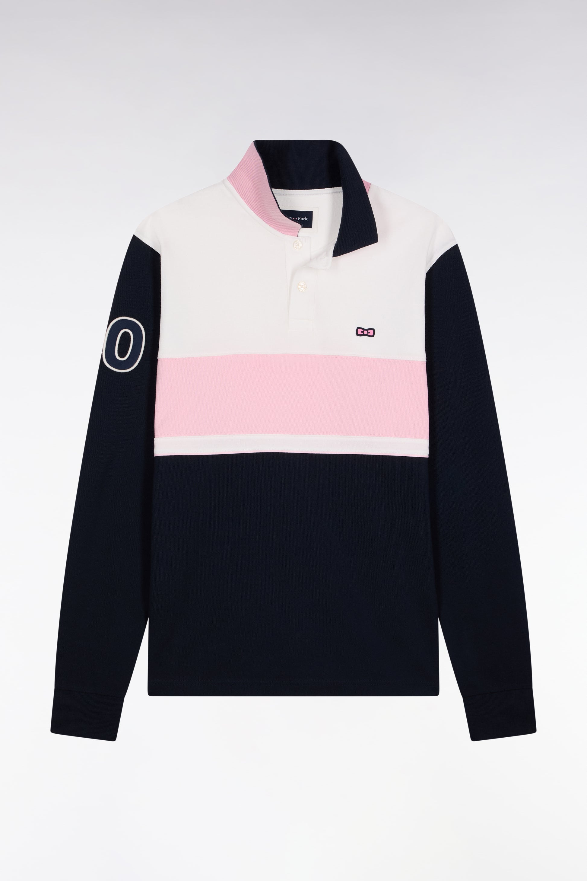 This long-sleeved polo shirt is inspired by iconic rugby jerseys with its wide pink stripe on a navy background and contrasting white yoke. The navy ribbed collar is subtly highlighted in pink, while the bowtie embroidery on the chest and the number 10 on the sleeve recall the sporting DNA of our French Maison.