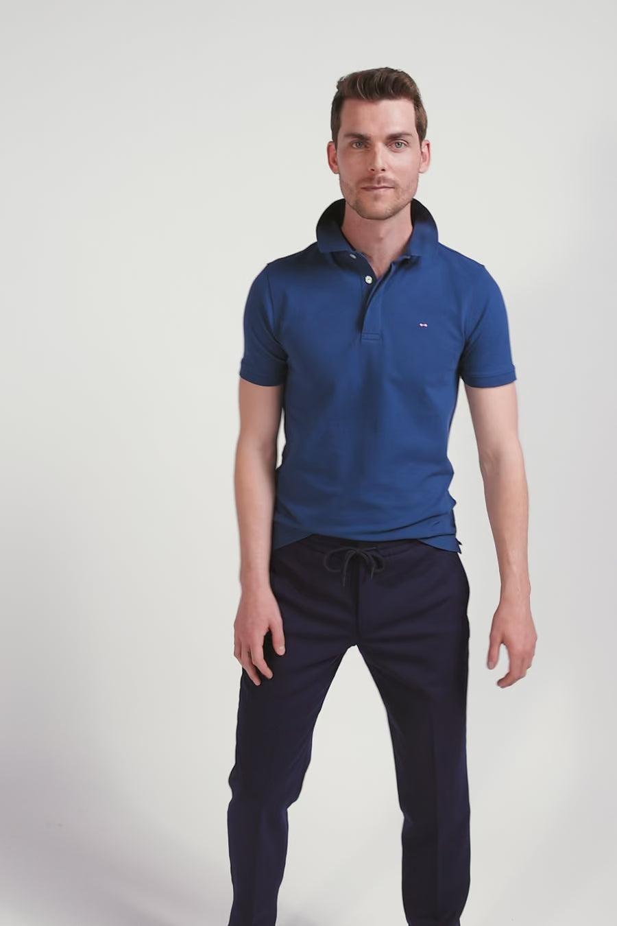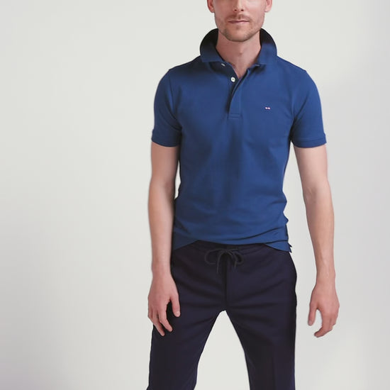Slim dark blue short-sleeved stretch cotton polo shirt
