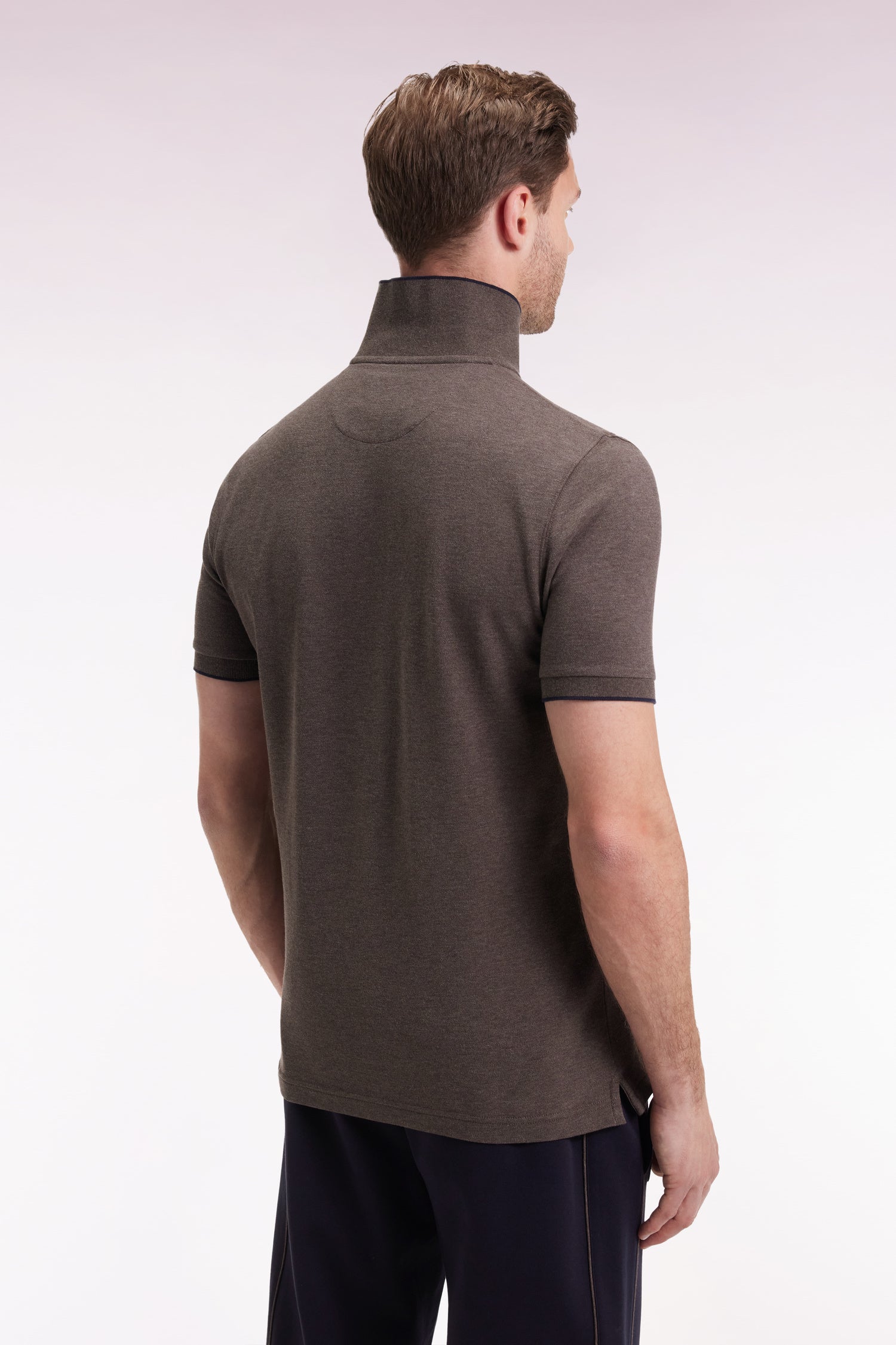 The stretch cotton piqué chosen for this slim-fitting polo naturally hugs the silhouette. Its plain base and meticulous details, such as the zipped collar and fine contrasting stripe around the collar and sleeves, make it a trendy and original piece.