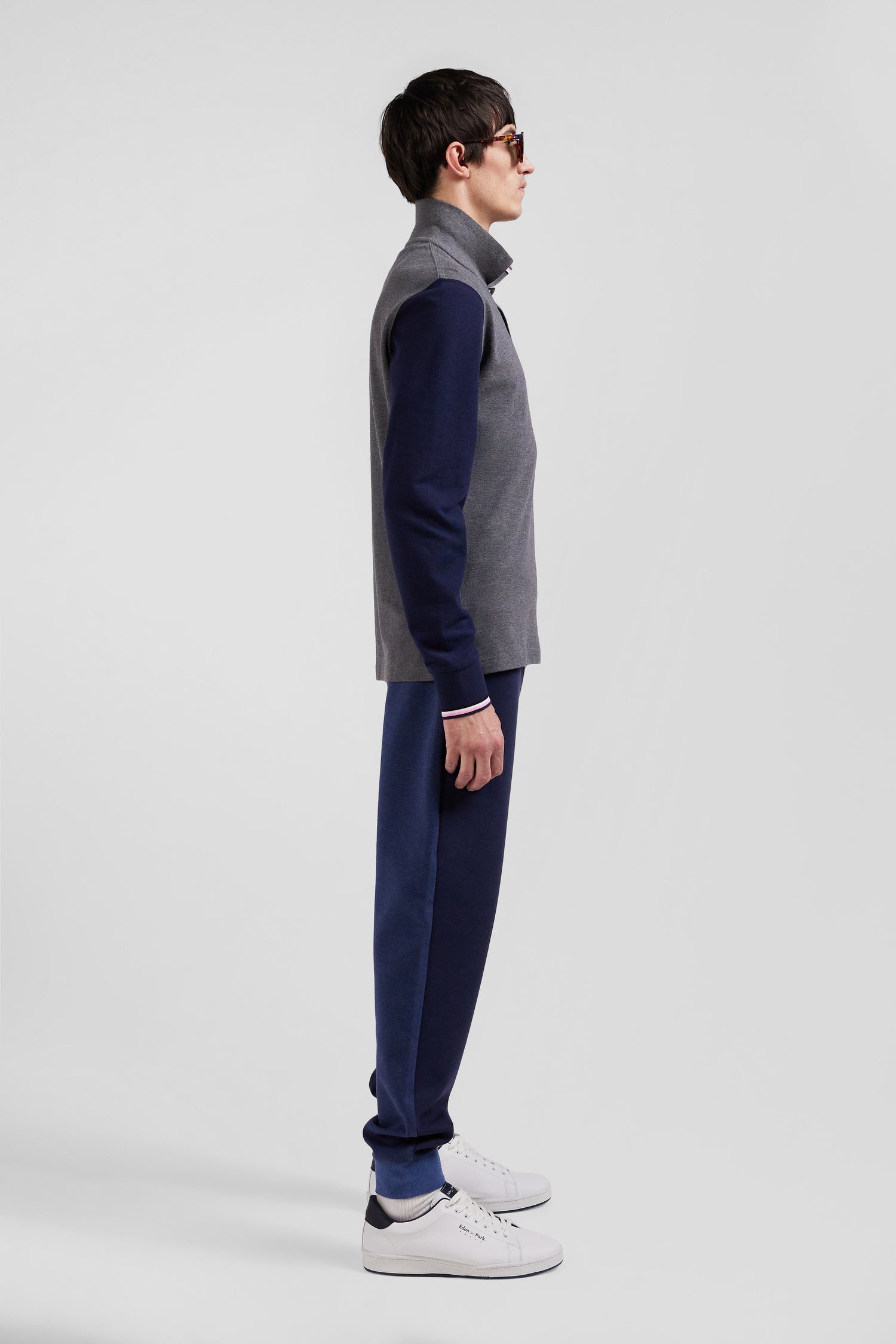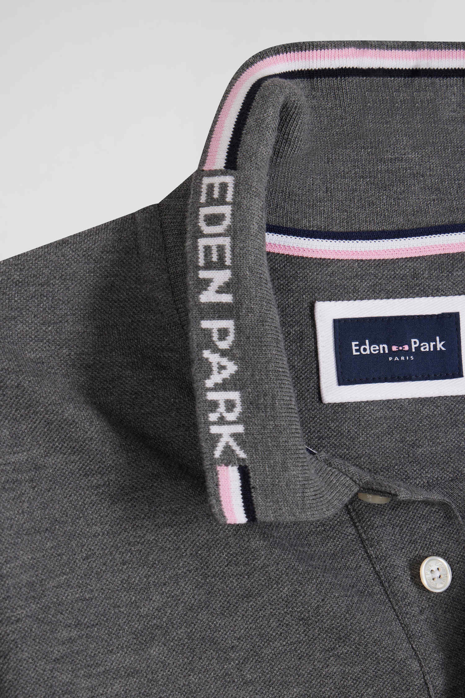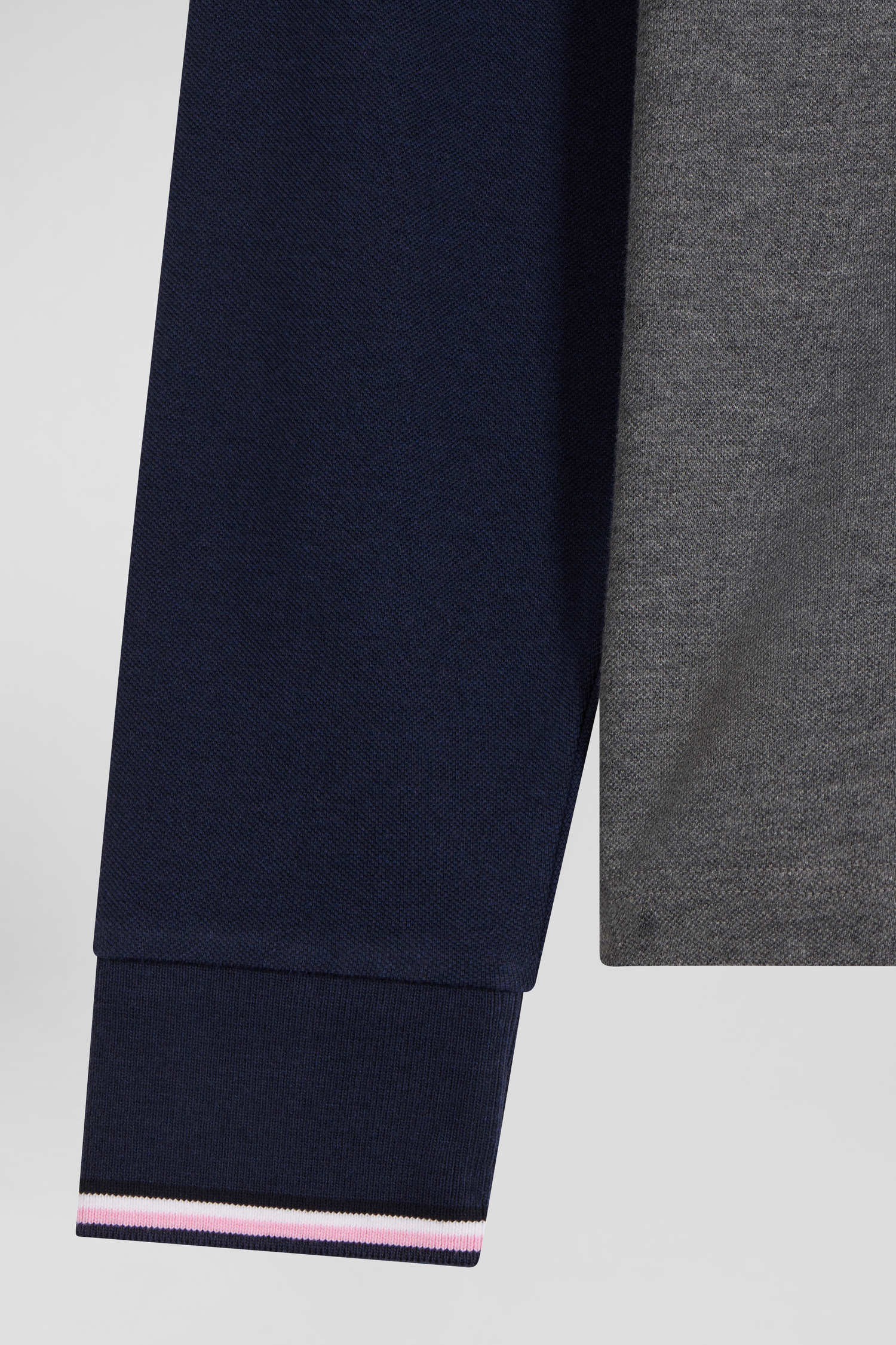 Regular grey long-sleeved cotton piqué polo shirt with jacquard collar and rubber badge