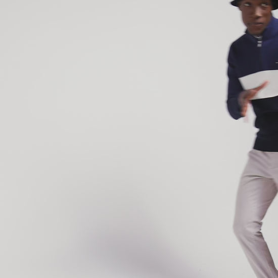 This stand-up zip-neck sweater reveals meticulous finishes such as the elegant vertical stripes on the inside, the jersey half-moon and the tricolored knit detail that enrich its interior with distinction. Alternating pearl ribbing, reverse jersey and Ottoman stitch create a subtle contrast, offering a versatile piece in three timeless shades for everyday style.