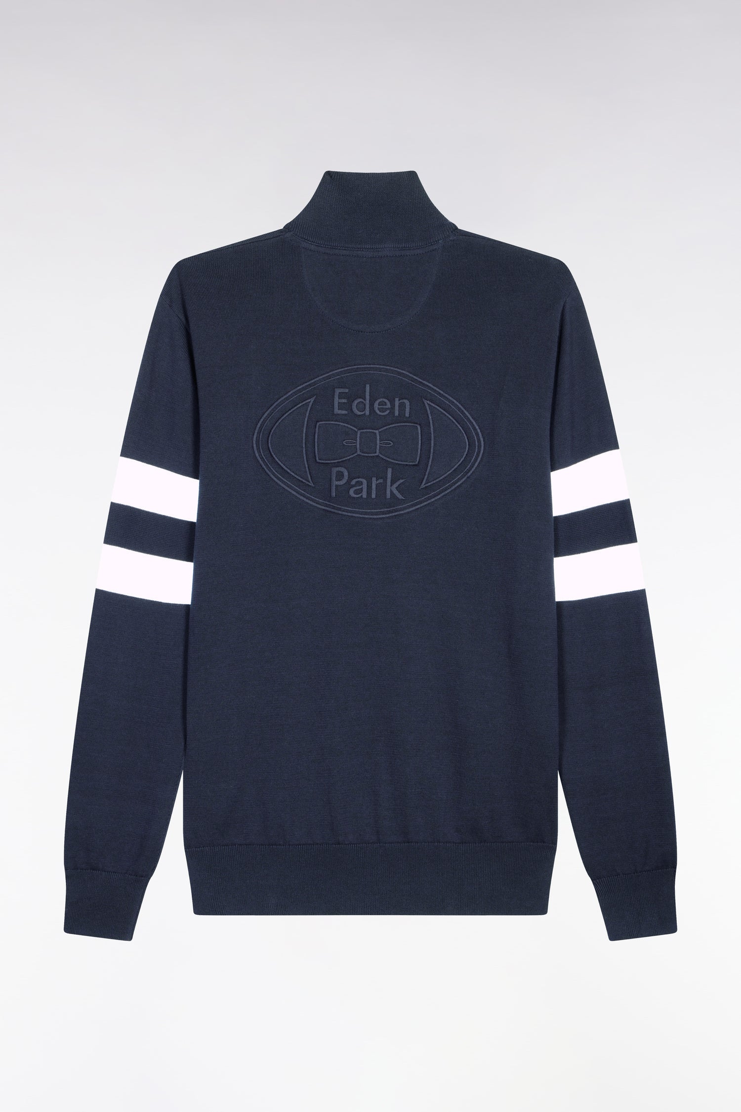 Ce pull masculin à col camionneur incarne l’esprit sport chic emblématique des collections mode de la Maison. Réalisé en tricotage jersey, ce modèle se distingue par ses rayures contrastées en point ottoman sur les manches. Son zip au col et ses finitions bords-côtes soulignent une allure contemporaine soignée. Décliné en ciel, rose ou marine, ce pull homme est un clin d’œil élégant à notre héritage rugby. Inspiré des maillots de l'ovalie il en propose une version soignée et contemporaine pensée pour une silhouette plus urbaine.