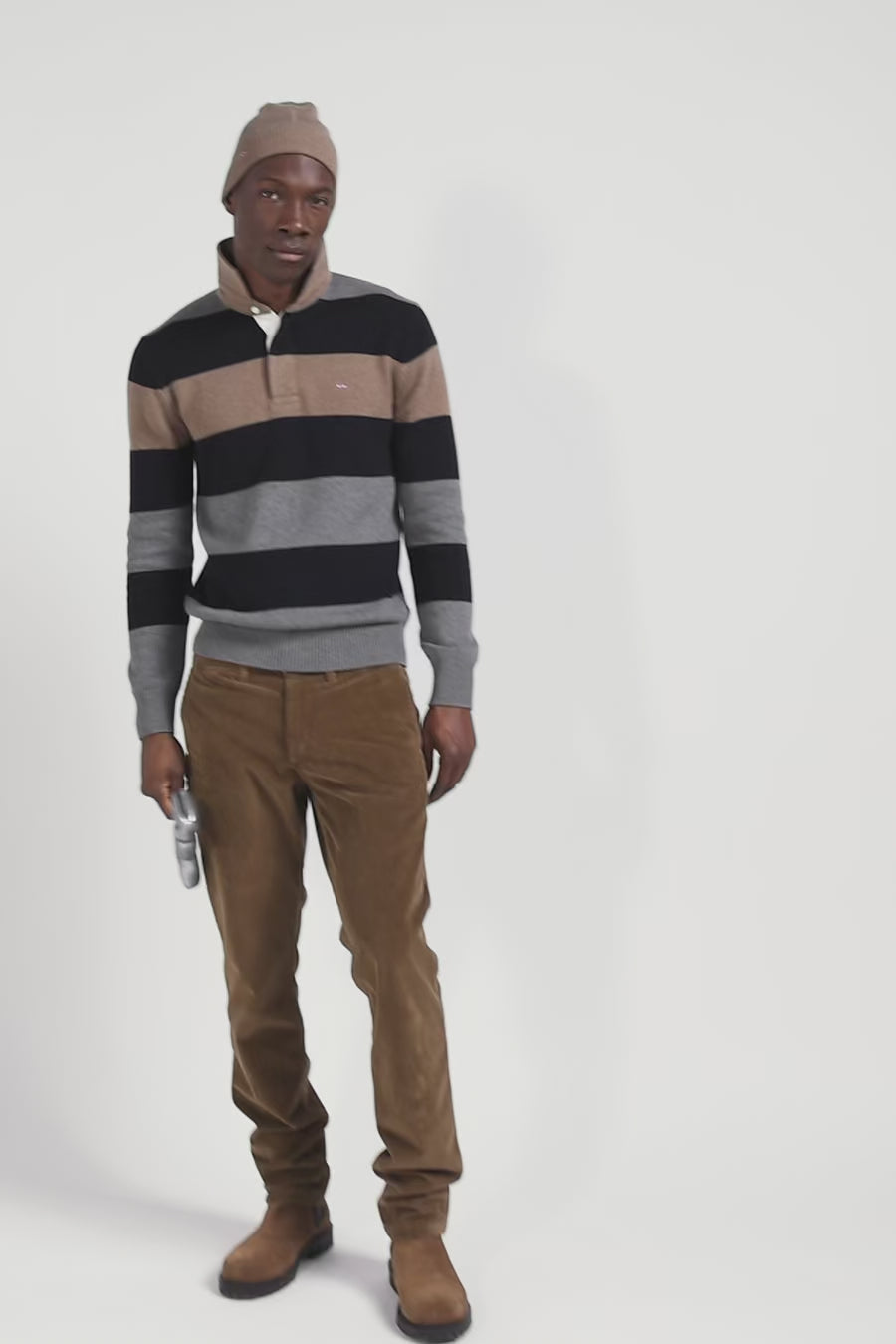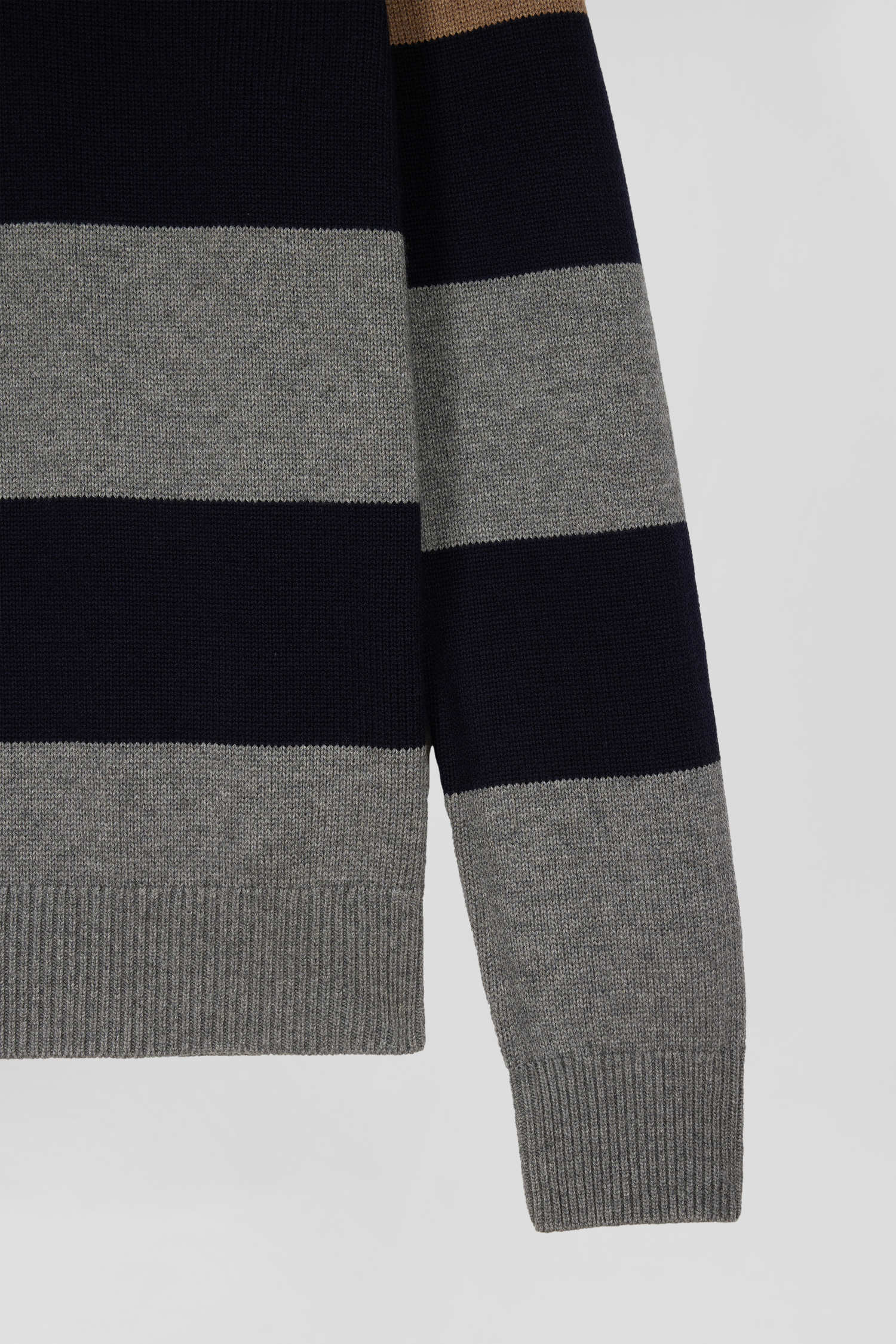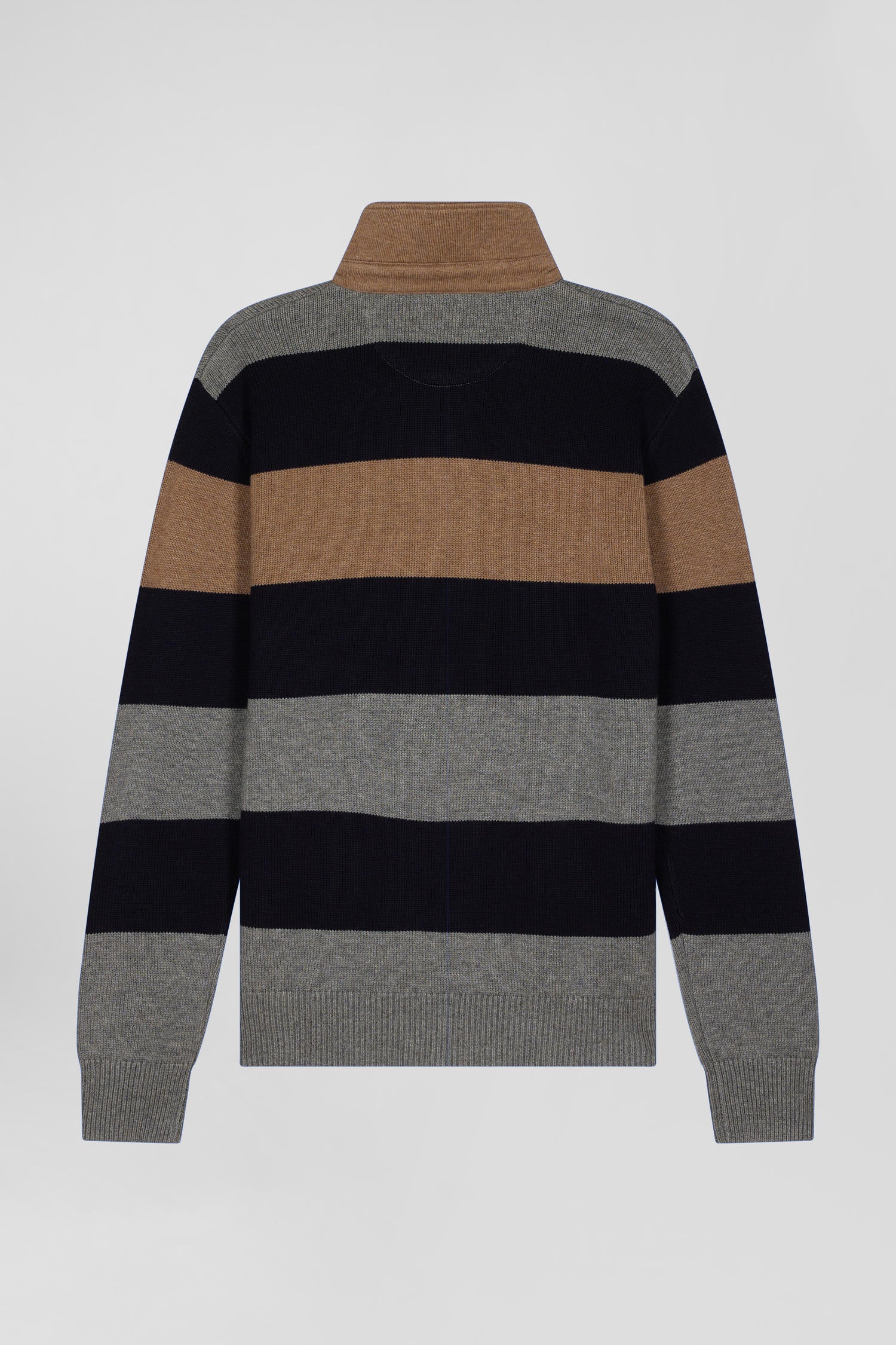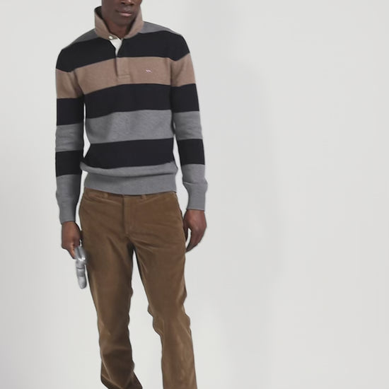 Our men's jersey-neck sweater, designed in a harmonious blend of wool and cotton, offers both warmth and softness. This sweater features a jersey half-moon and a tricolored knitted liner ribbon on the inside, adding a refined touch and a nod to our sporting heritage. The effect of contrasting dots enriches the design of this sweater, while its horizontal stripes, inspired by rugby jerseys, bring a sporty and authentic spirit to this masculine sweater.