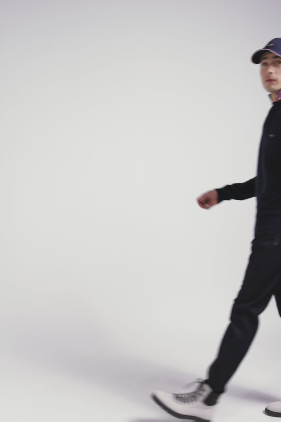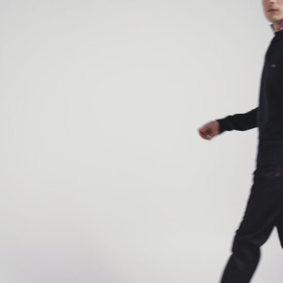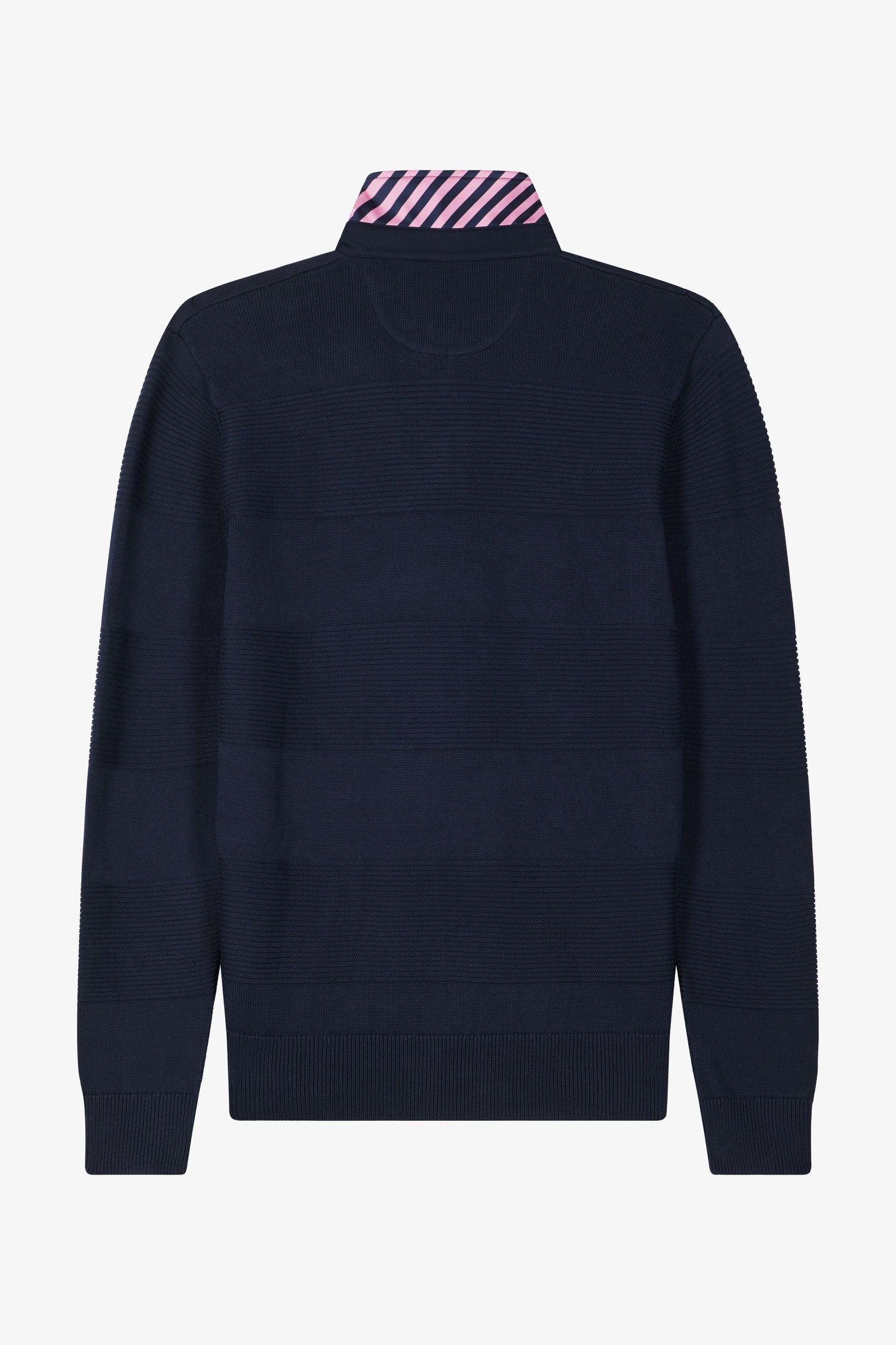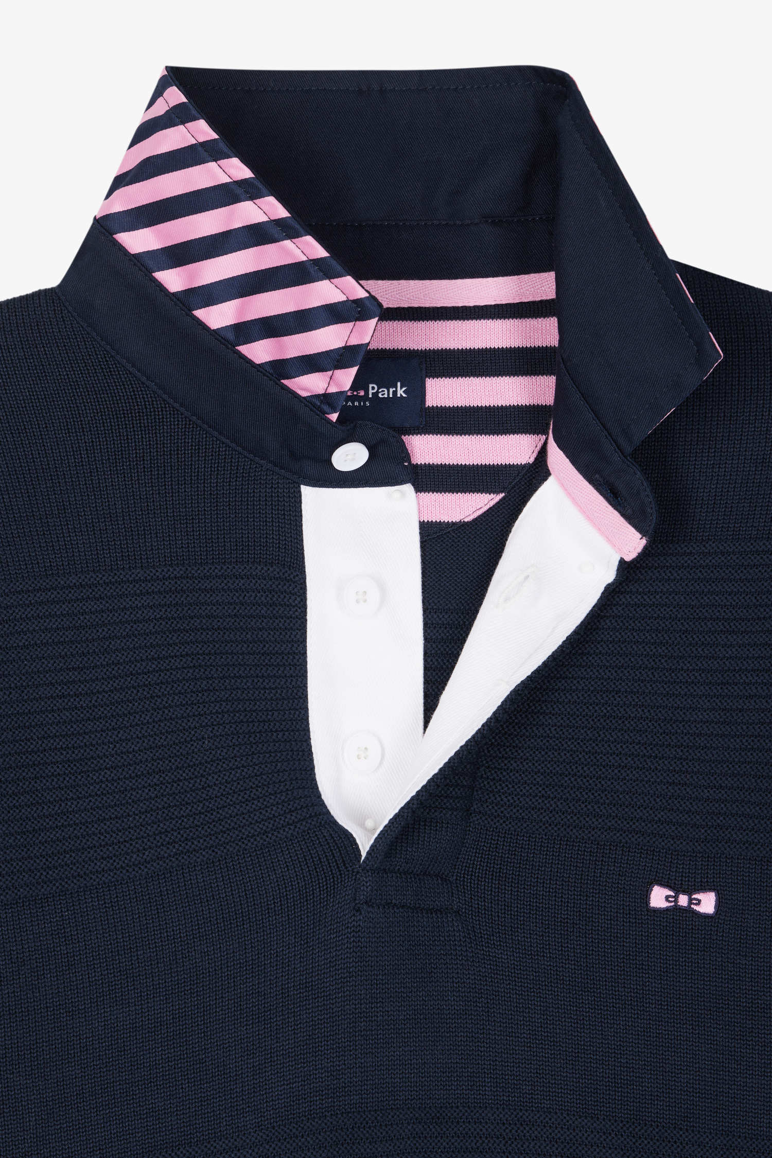 Face cooler days in style with this cotton polo-neck sweater featuring a white button placket. Designed to combine comfort and style, this men's sweater is crafted from quality cotton in a variegated knit for a tone-on-tone play of relief inspired by the hooping on rugby jerseys, a detail also repeated on its collar and inner half-moon.