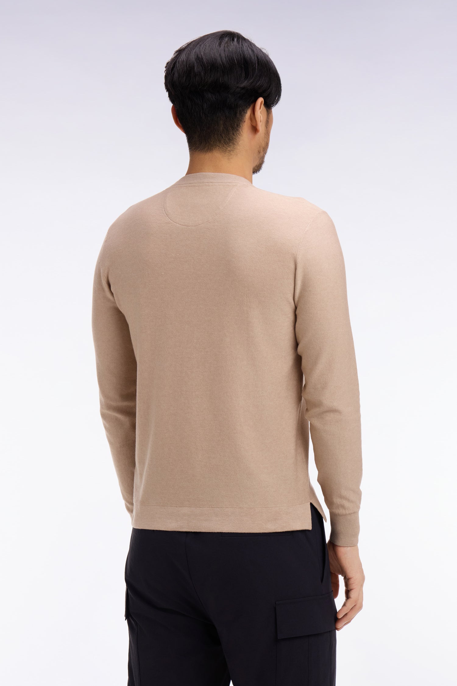 Ce pull homme col rond se distingue par son tricotage en jersey envers qui lui apporte une texture subtile et moderne et son alliance de coton, lyocell et polyester assurant une plus grande douceur, résistance et facilité d'entretien. Orné de notre nœud brodé sur la poitrine, ce classique masculin affirme une présence discrète et soignée. Sa finition tubulaire au bas, soulignée par deux discrète fentes d’aisance, apporte confort et fluidité au porté. Une pièce idéale pour enrichir le vestiaire masculin de saison.