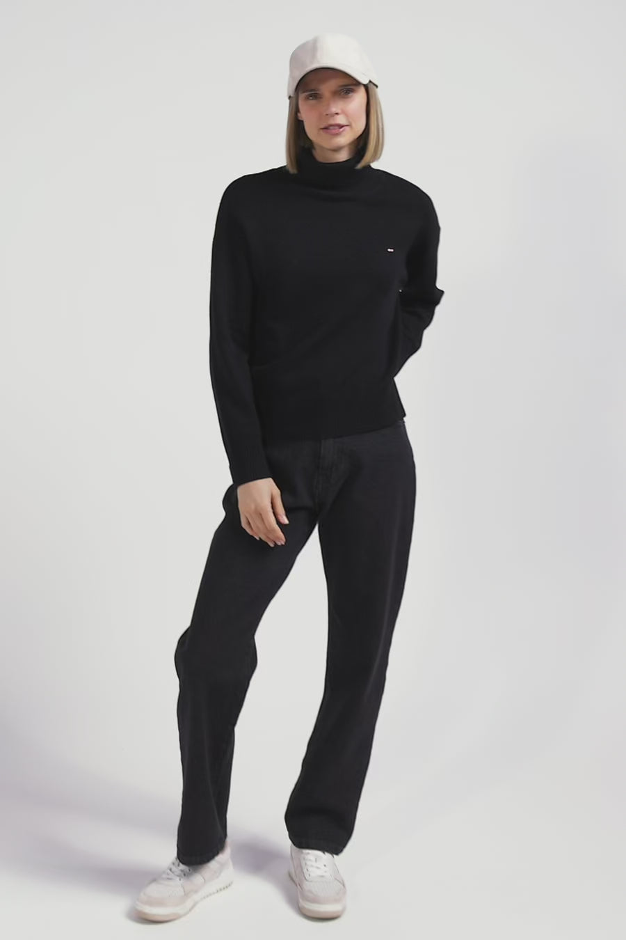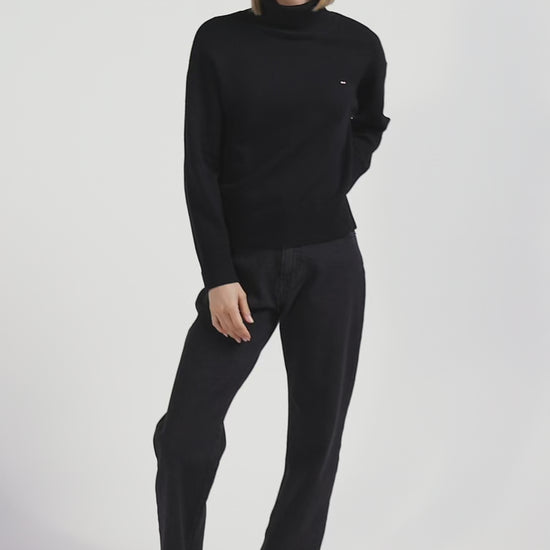 This plain turtleneck sweater, designed in a comfortable blend of natural fibers combining 55% wool and 45% cotton, combines warmth and softness. Featuring ribbed edges for a neat finish and perfect fit, this feminine, slightly loose-fitting sweater is adorned with Eden Park's signature discreet bow-tie embroidery. Available in six timeless colors, this soft turtleneck sweater is ideal for enhancing your winter wardrobe with elegance and simplicity.