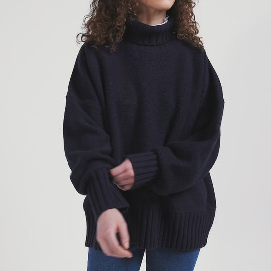Our turtleneck sweater, knitted in reverse stockinette stitch from a blend of virgin wool and recycled polyamide, guarantees warmth and durability. Its wide sleeves tightened at the cuffs by knitted ribbing add a touch of contemporary sophistication to this timeless piece. Perfect for winter days, this feminine sweater in navy or grey in a trendy oversized cut will become a wardrobe staple worn with raw denim jeans or suit pants.
