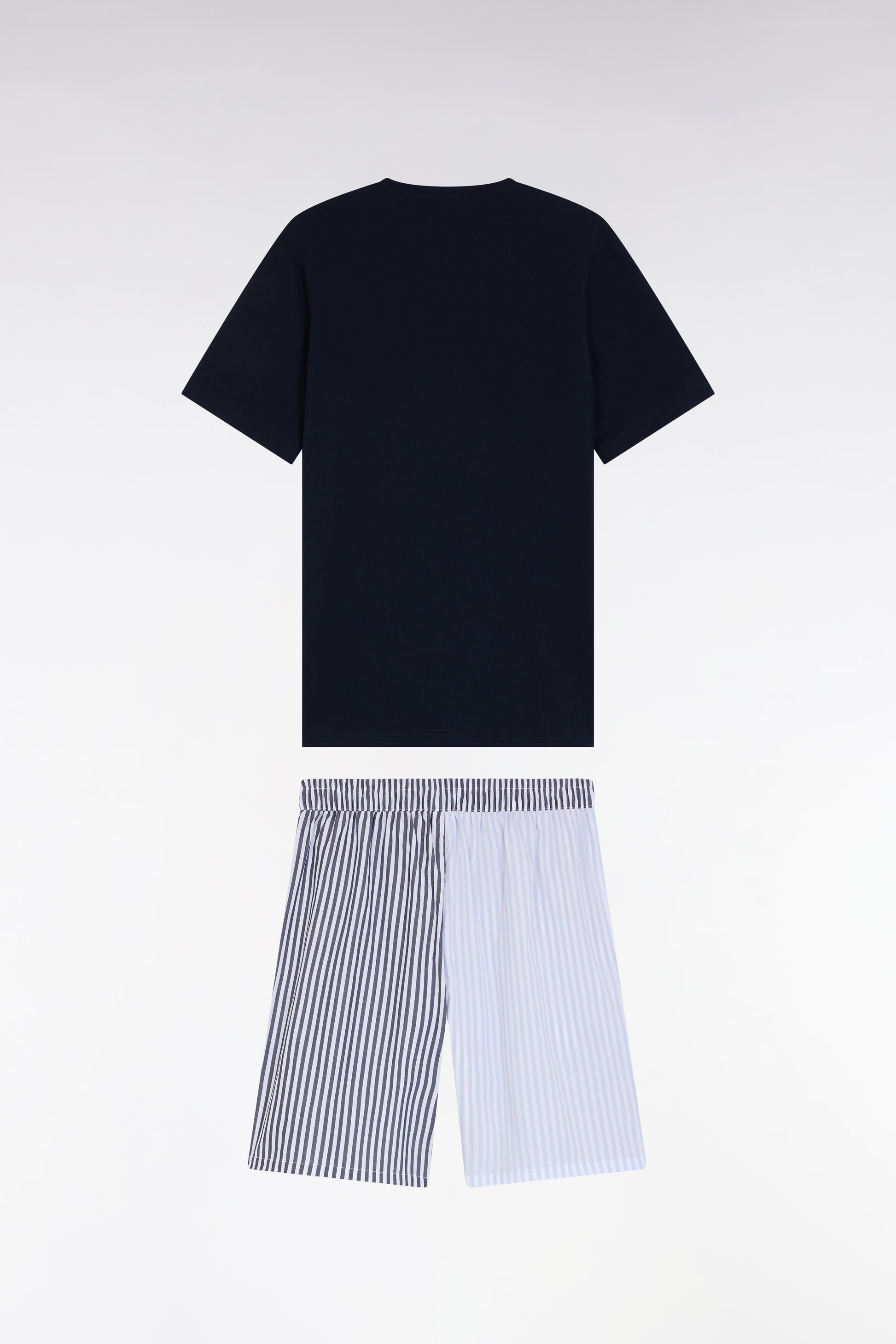 These short pyjamas feature a navy short-sleeved t-shirt with round neck and cotton shorts with elasticated waistband and stripes. These masculine pyjamas offer optimum comfort and a sporty-chic look for your moments of relaxation. Available in navy and sky or navy and pink, our signature colors.