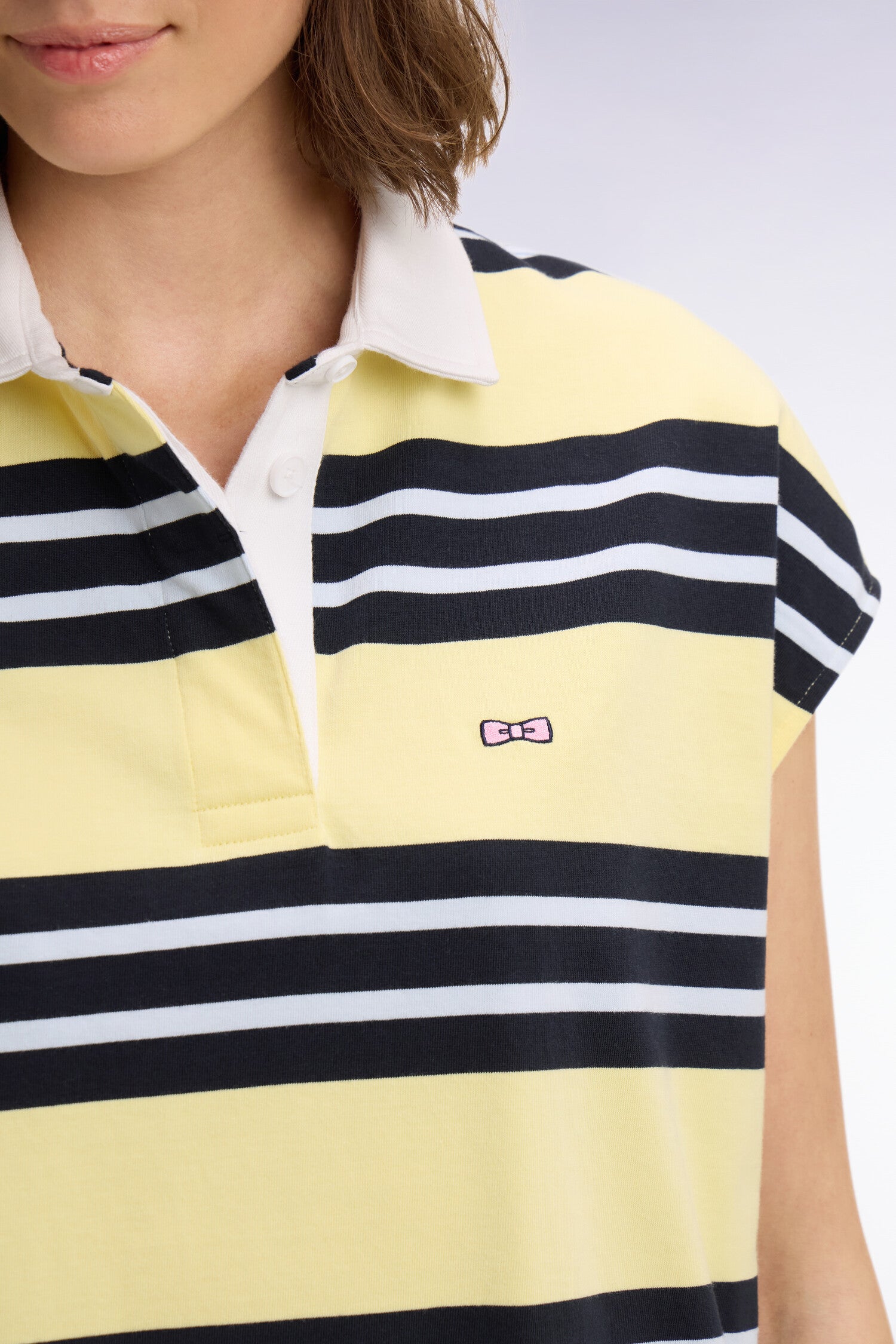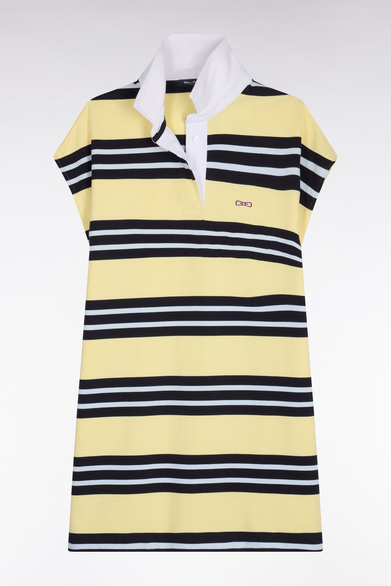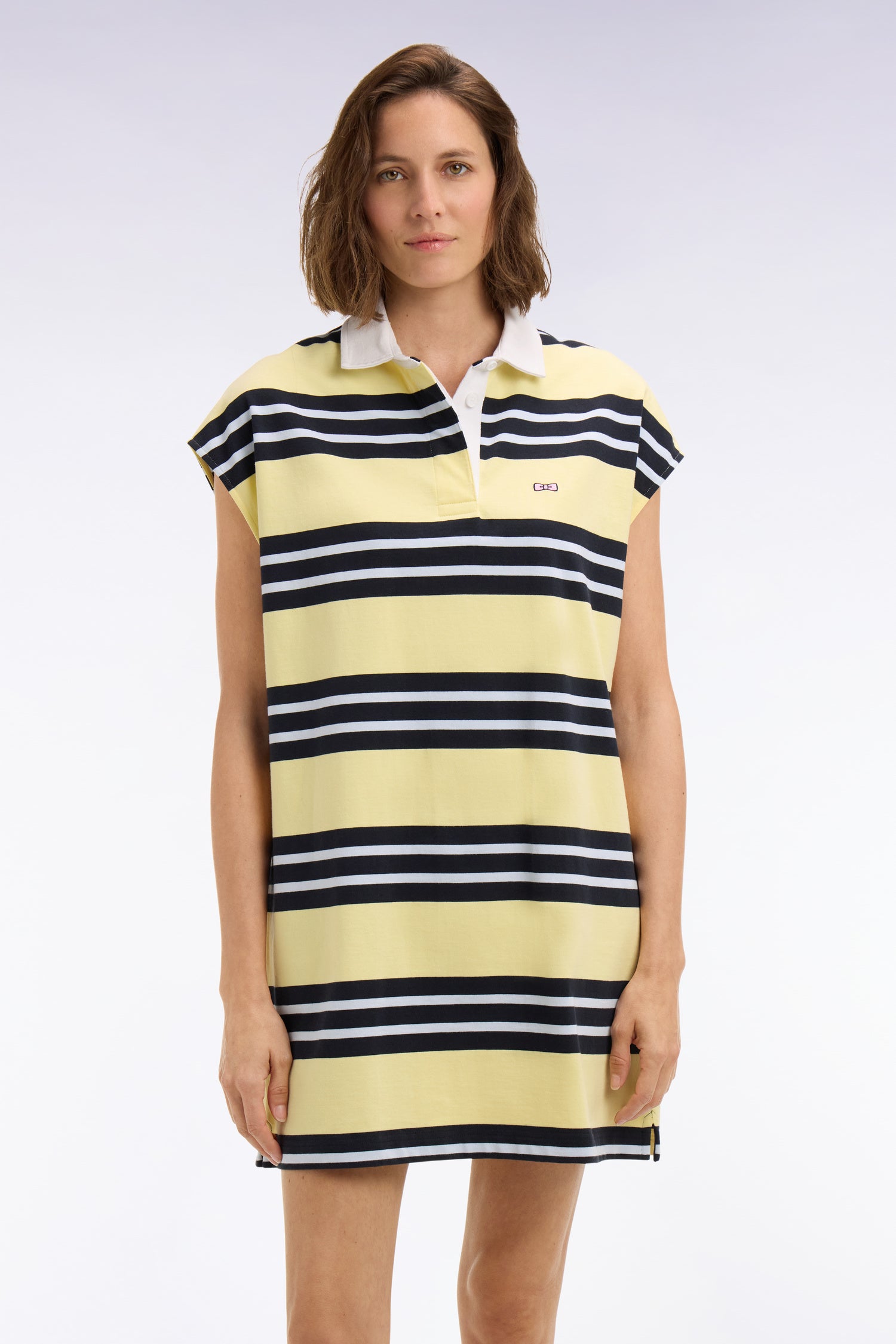 Cette robe maillot sans manches en coton pur revisite l’esprit rugby dans une version féminine et estivale. Ses rayures jaune et marine ensoleillent le vestiaire de la saison tandis que son col maillot blanc et sa plaquette en ruban herringbone lui confèrent une allure sport chic affirmée. Cette pièce graphique et confortable adopte une coupe oversized, gage de confort et de modernité tout au long de la journée.