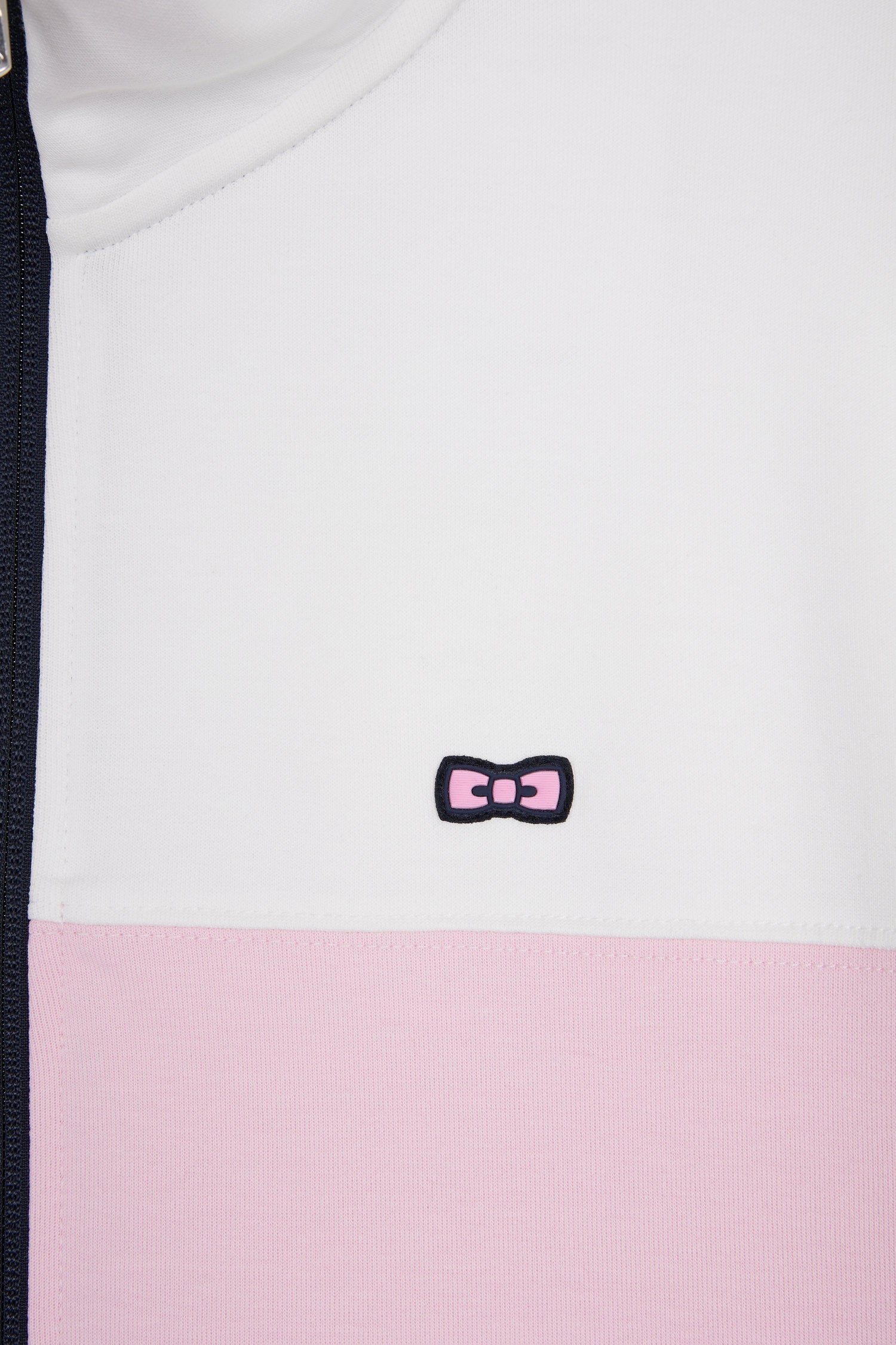 This zip-up sweatshirt with stand-up collar features a balanced tricolor construction and subtle interplay of materials. The off-white fleece top is accented by a pale pink stripe, while the contrasting navy nylon bottom adds structure and modernity. Wear as a sweatshirt or mid-season jacket