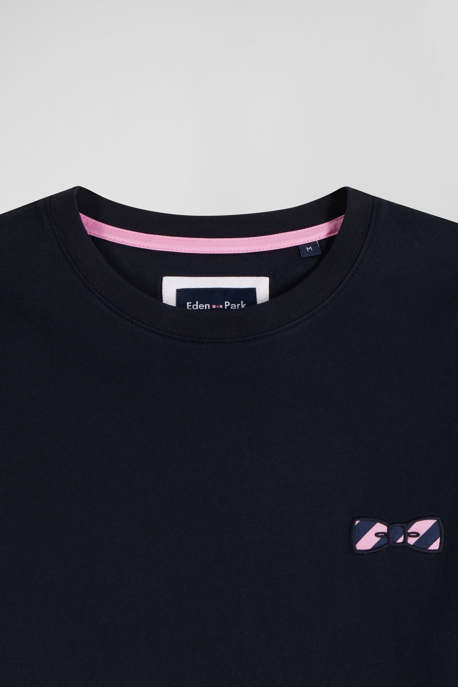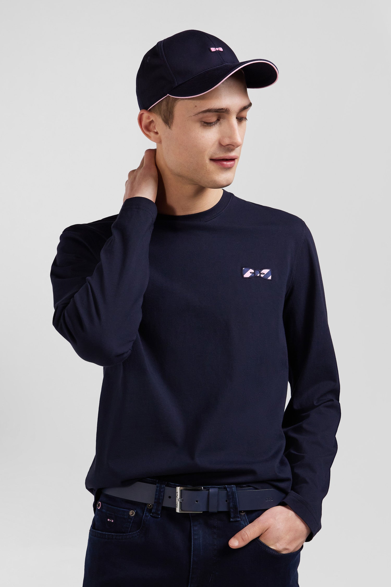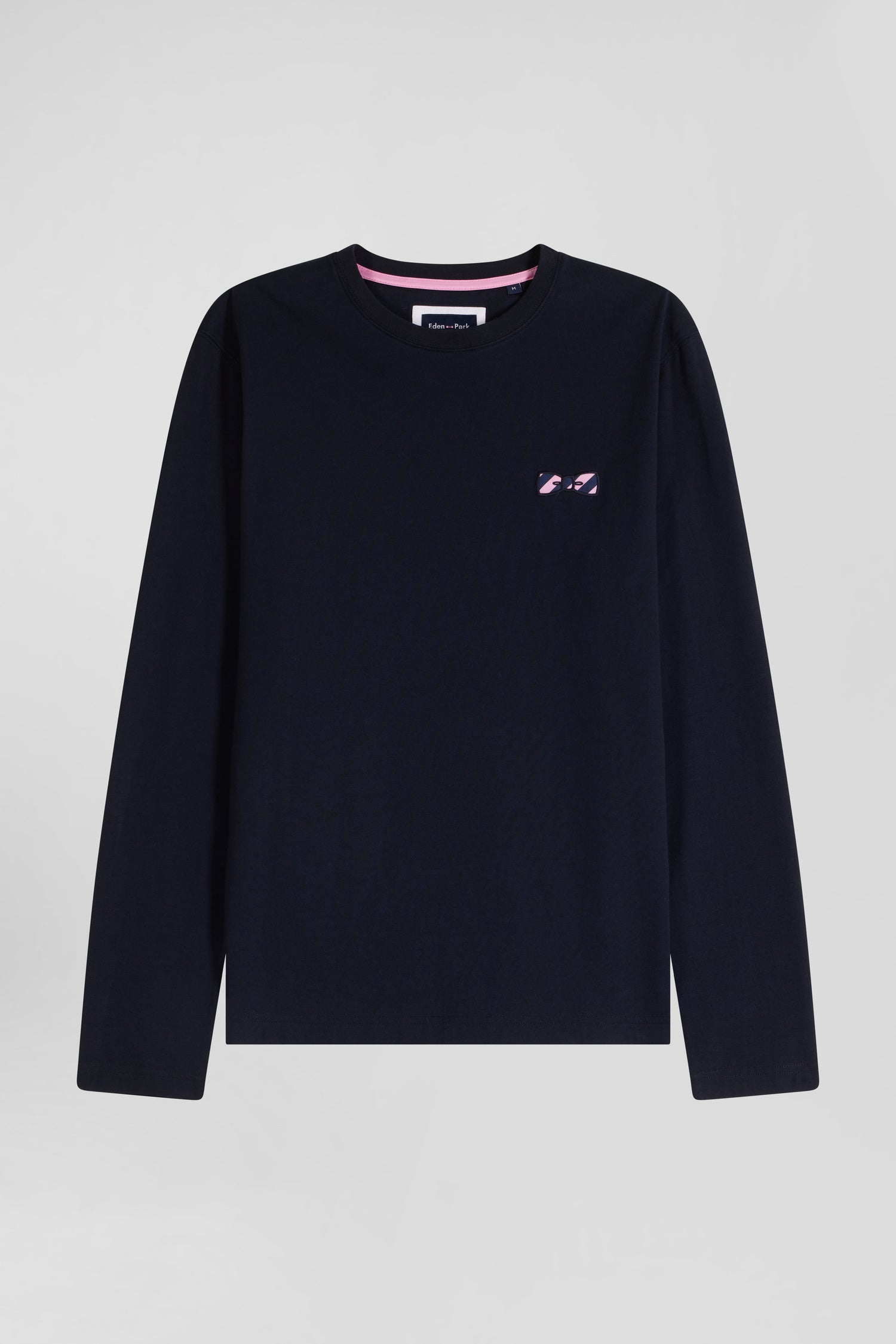 Regular navy blue embroidered long-sleeved cotton T-shirt