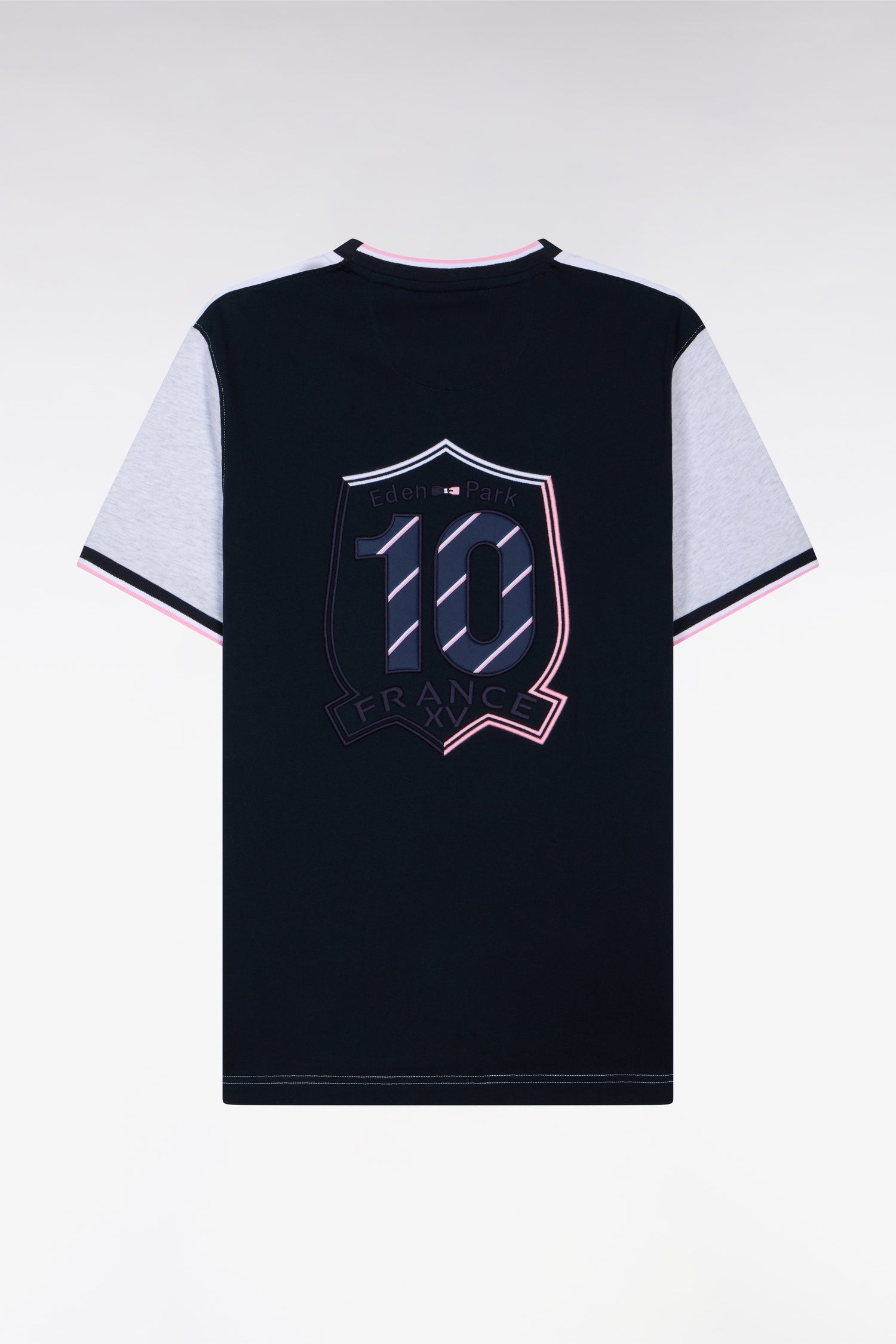 Ce T-shirt en jersey de coton à la coupe regular joue sur un contraste graphique entre dos marine, devant blanc et manches grises aux finitions bords-côtes. Au dos, une broderie exclusive rehaussée de tissu cravate rayé met en scène l’écusson XV de France, et le 10 signature forte de la Maison. Les finitions en bords-côtes rayés et le logo FFR sur la poitrine complètent ce modèle au style sport chic affirmé.