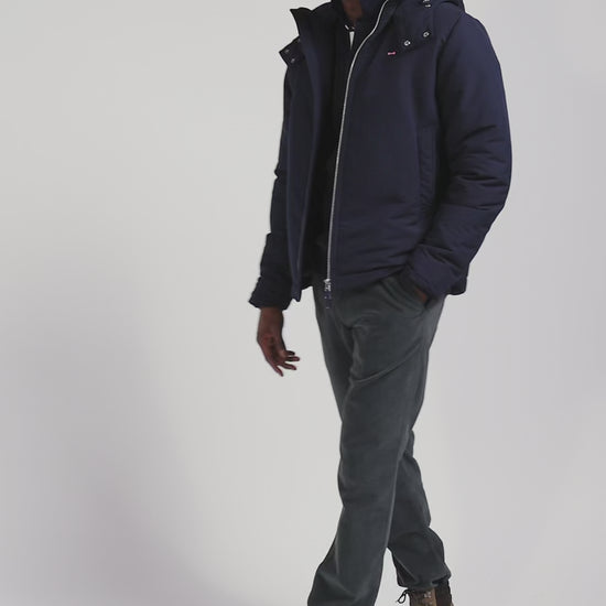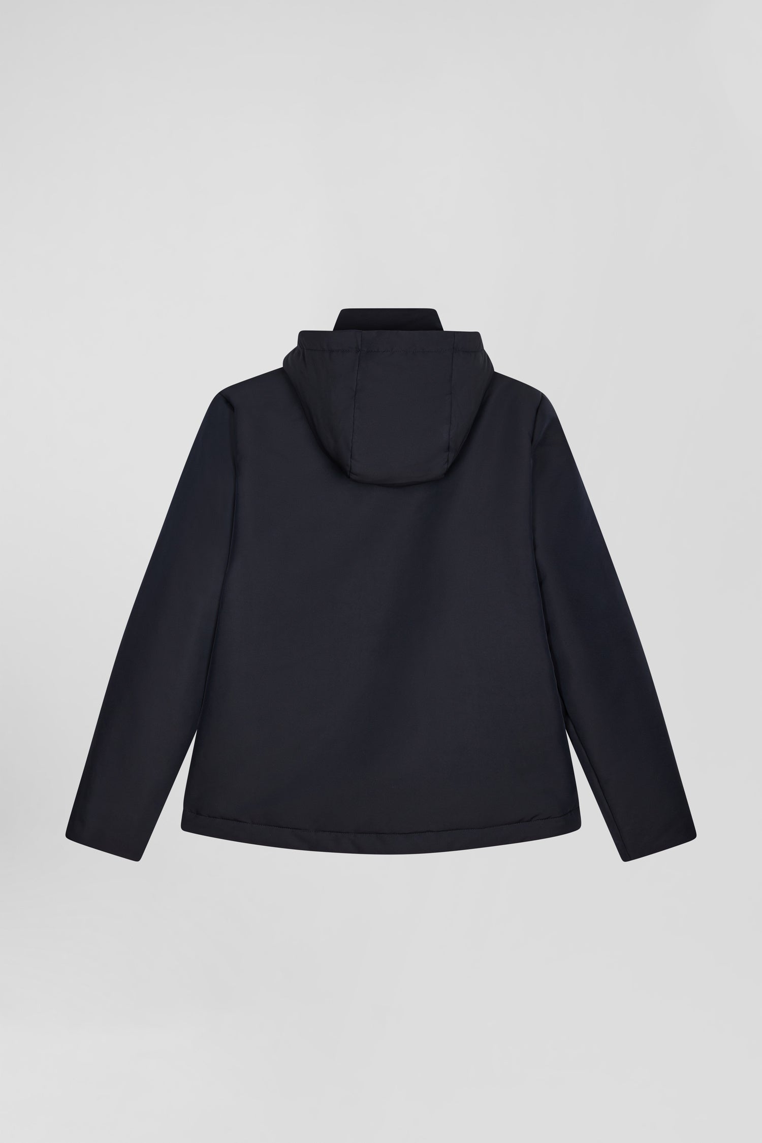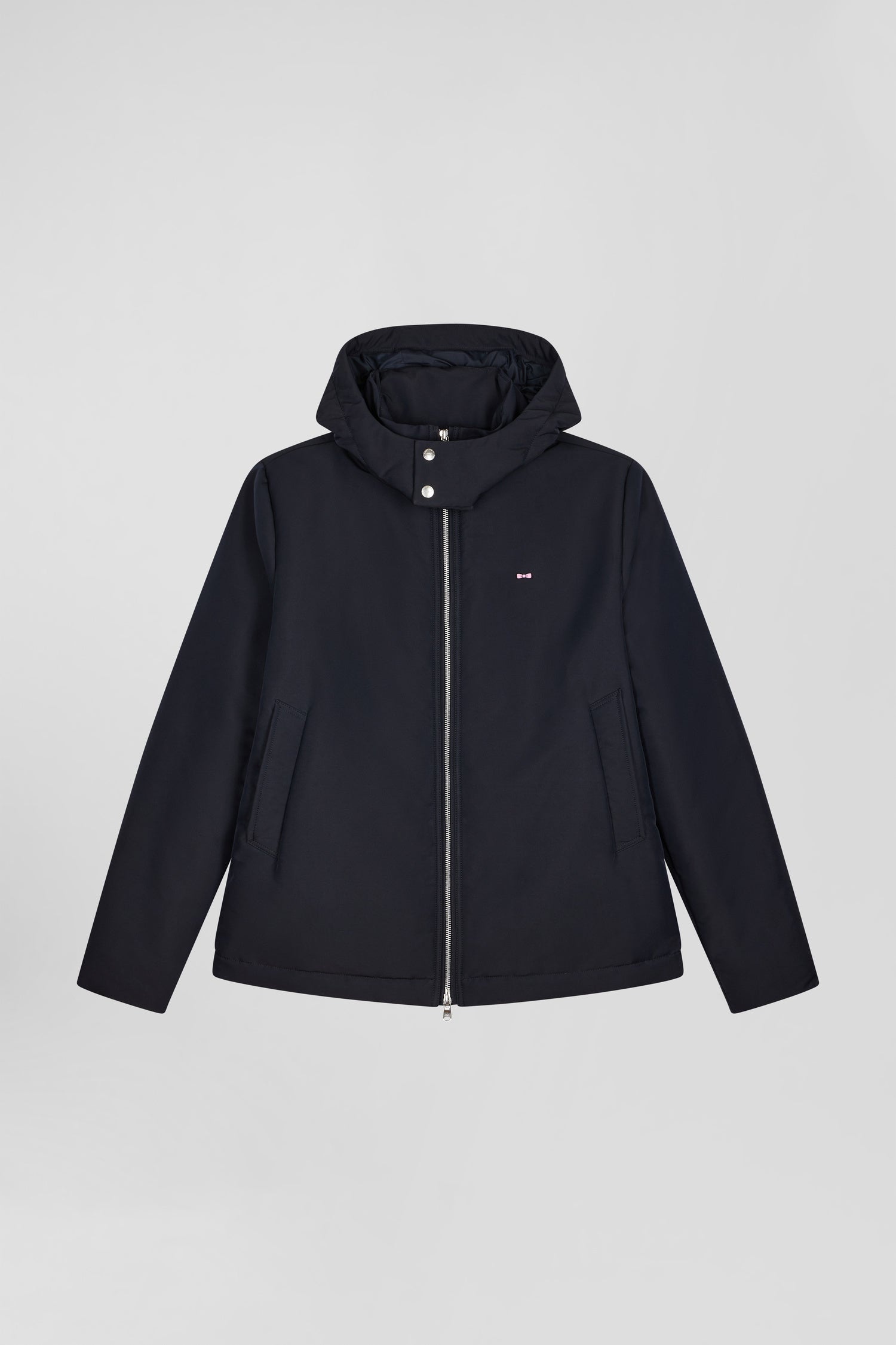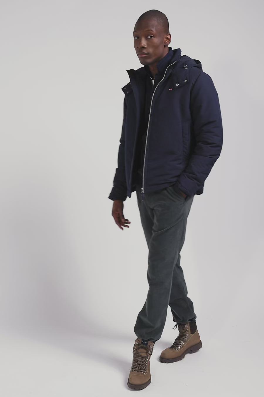 Découvrez l'alliance parfaite de fonctionnalité et de style avec ce blouson en nylon au toucher peau de pêche. Complété par une capuche fixe à fermeture pression et une doublure nylon unie, ce blouson homme assure confort et protection. Son zip double curseur siglé et ses poches passepoilées s'associent à deux poches intérieures zippées pour une praticité maximale. Les manches sont rehaussées de bords-côtes tricotés.