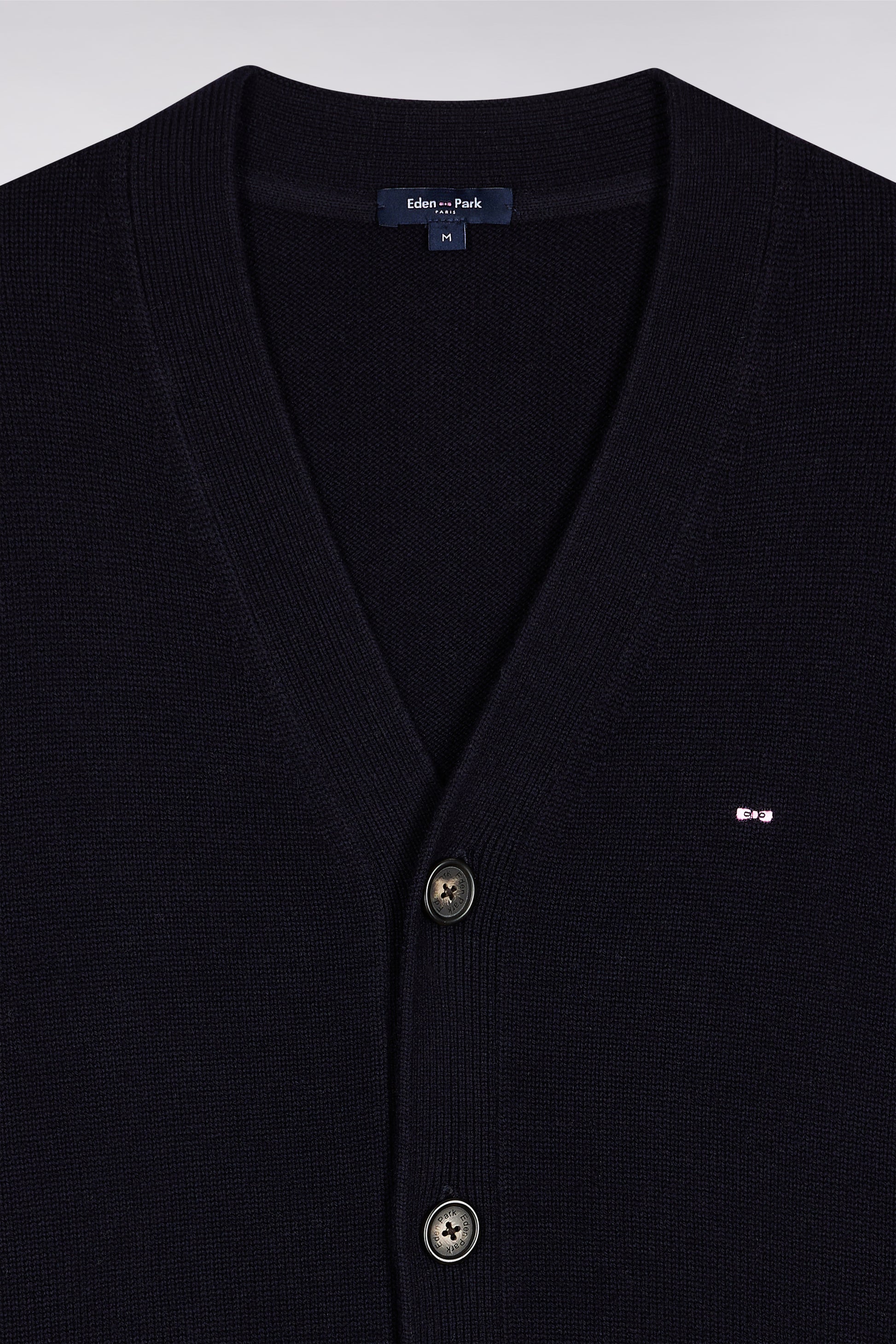 Le style de notre maison se reconnaît à ses équilibres subtils : rigueur de la coupe, matières de qualité et liberté du détail. Avec sa maille épaisse tricotée à plat dans un doux mélange laine - coton, ce cardigan col V incarne l’alliance parfaite entre savoir-faire et durabilité. Pensée pour durer, sa construction robuste et ses finitions soignées, de la patte de boutonnage aux bords-côtes, en font une pièce forte du vestiaire masculin, capable de traverser les saisons sans perdre de son élégance. La broderie nœud papillon rose signe discrètement cette pièce d’exception, fidèle à l’héritage Eden Park