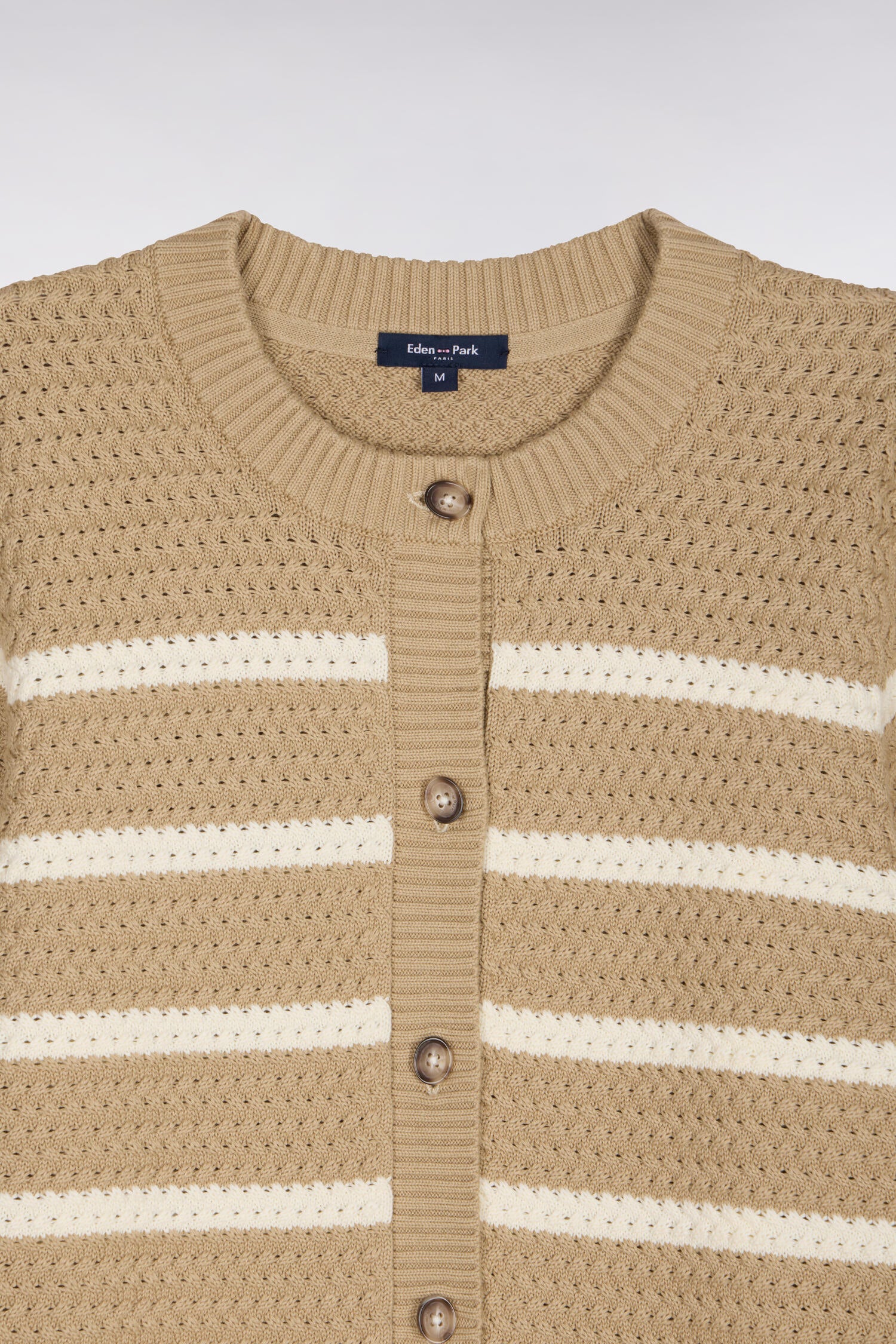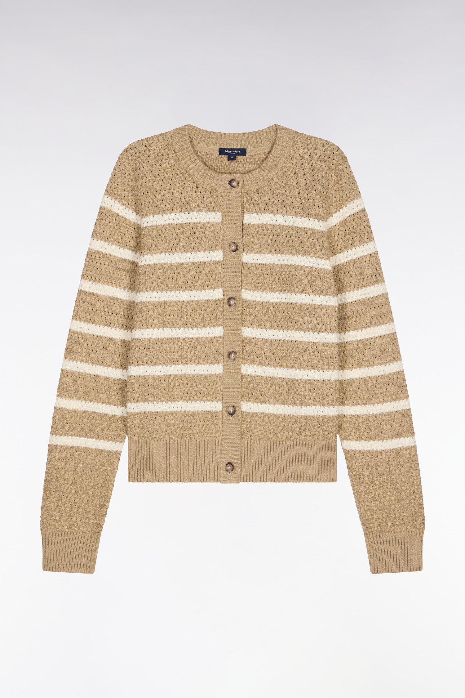 Ce cardigan d'inspiration marinière confectionné par nos ateliers en maille tressée en pur coton revisite un classique du vestiaire féminin avec une touche graphique et contemporaine plus estivale. Décliné en beige ou en marine, il séduit par son jeu de textures et ses rayures subtilement contrastées qui apportent profondeur et relief. Sa coupe confortable et ses finitions en bord-côtes structurent la silhouette féminine avec élégance. Porté ouvert sur le pull manches courtes assorti ou fermé avec un jean flaire, ce cardigan rayé compose des tenues féminines à la fois modernes et intemporels. Glissez ce cardigan dans votre valise pour réchauffer une soirée d'été venteuse.