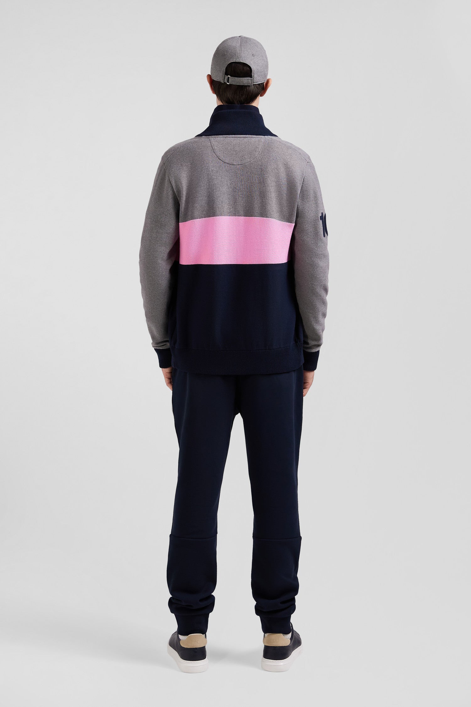Cardigan zippé à col montant tricolore gris broderie 10 et jeu de maille