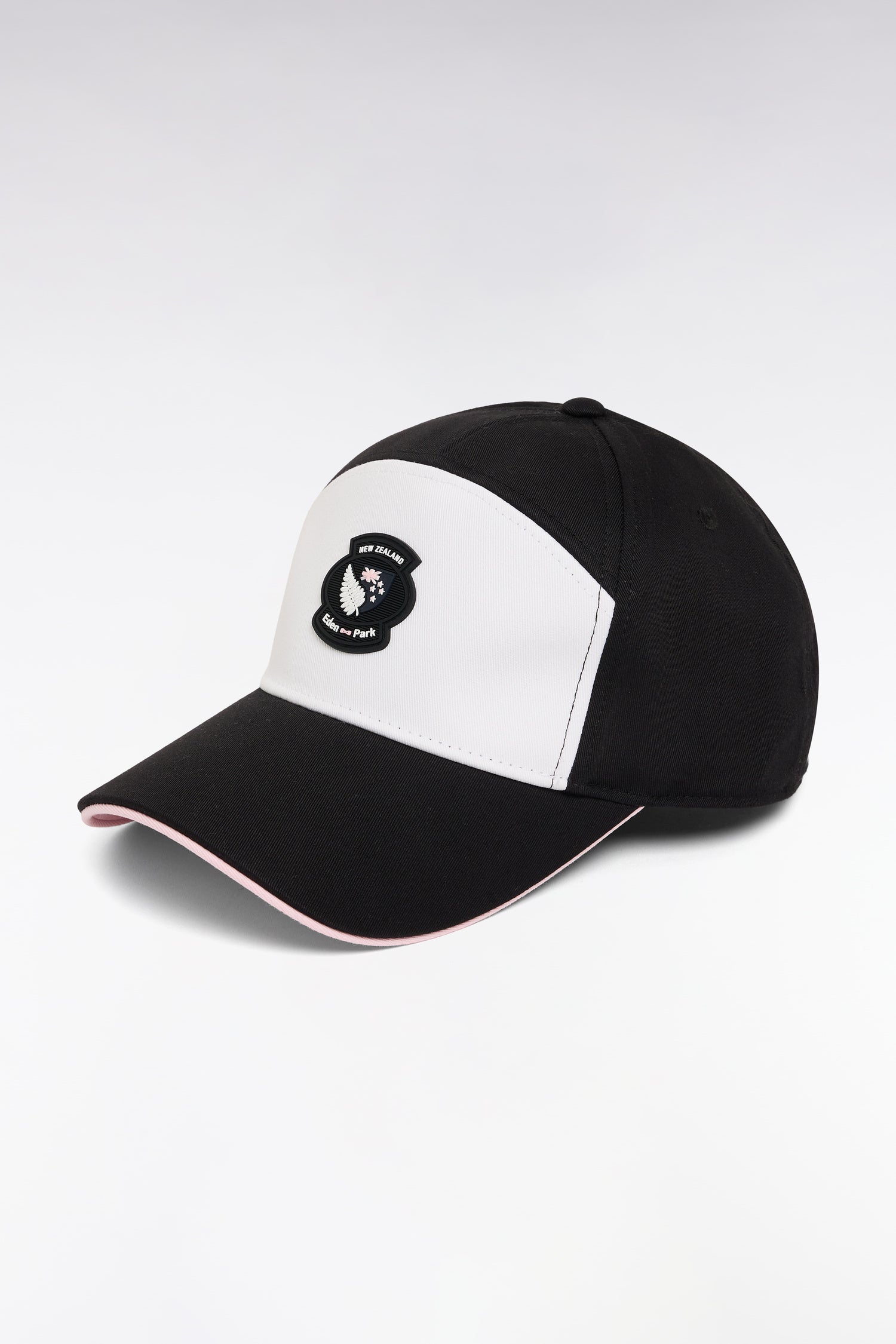 Cette casquette en twill de coton tricolore de notre ligne Nouvelle Zélande se distingue par sa découpe ovale sur le devant, clin d’œil graphique à l’univers rugby. Le dessous de visière rose et le passepoil contrasté soulignent son caractère sport chic, tandis que le badge en gomme reprenant les codes de cette terre passionnée par le rugby affirme une signature forte et contemporaine.