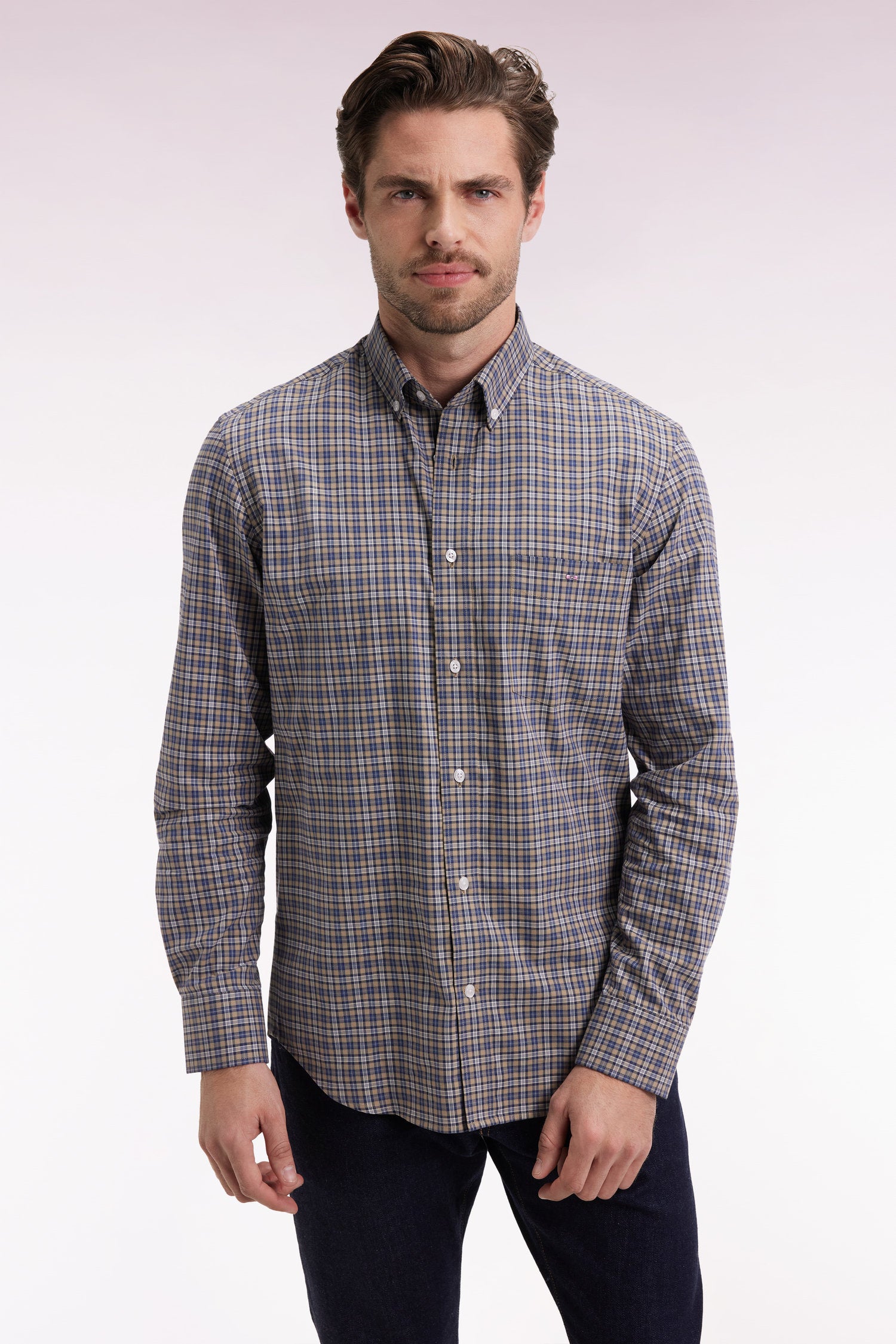 Cette chemise masculine à carreaux, déclinée en popeline de coton marine ponctuée de beige ou de rose, offre une élégance naturelle et discrète. Sa coupe droite et son coton doux en font une pièce confortable, idéale pour structurer une tenue décontractée avec allure