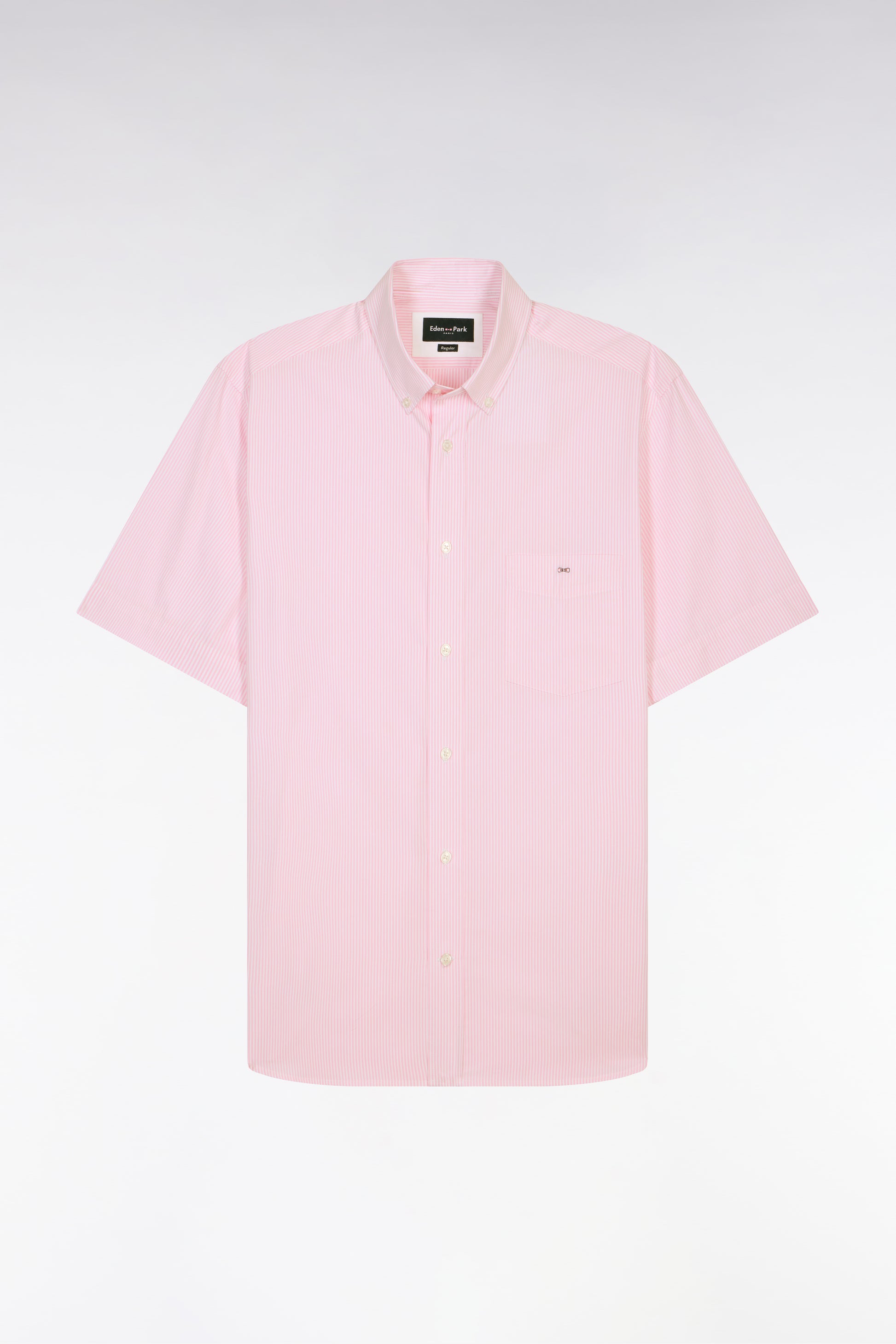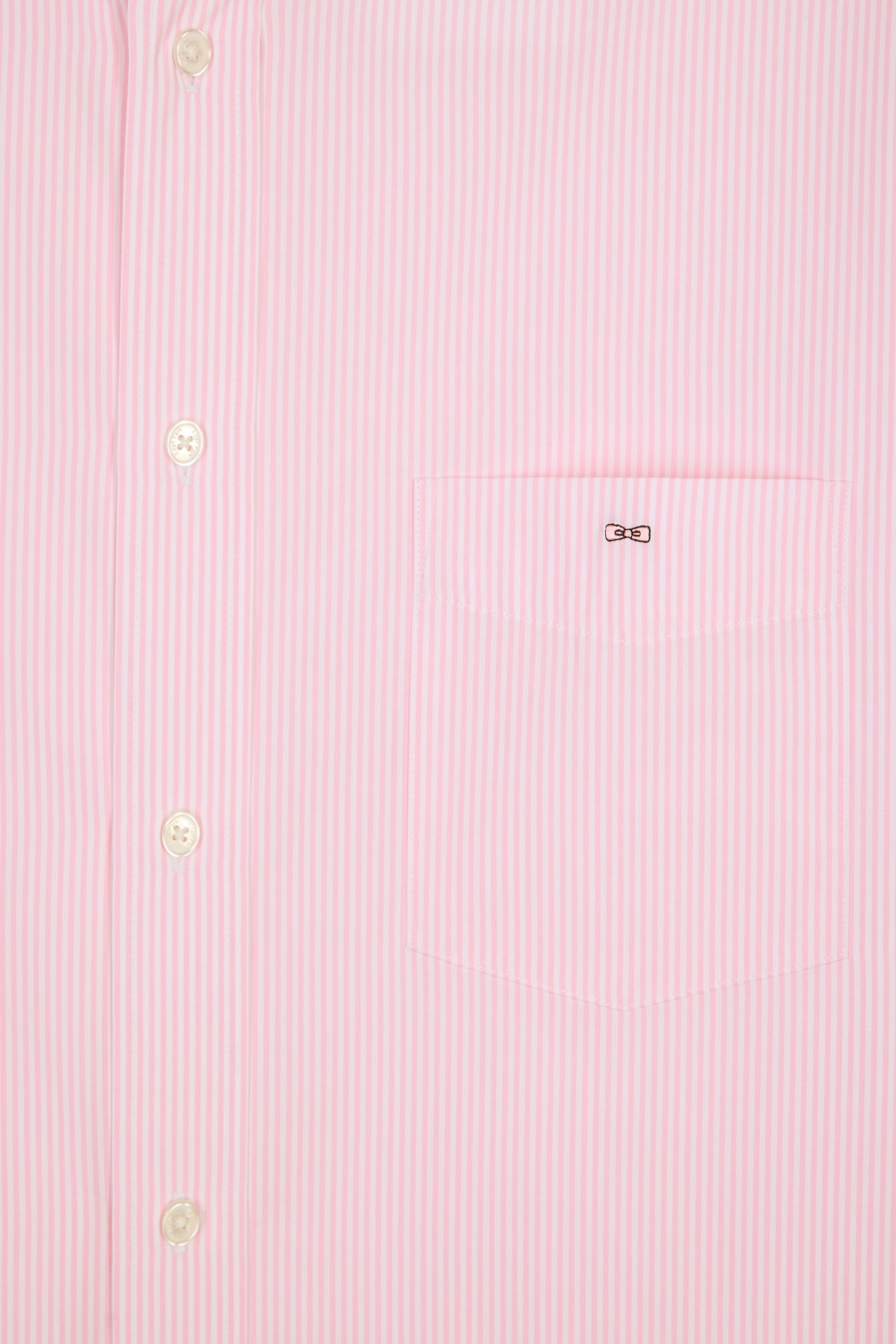 Confectionnée dans une popeline de coton douce et légère, cette chemisette à rayures bâtons, un symbole intemporel d'élégance masculine, est un essentiel de la saison. La popeline offre une tenue impeccable et une texture douce au toucher. Parfaite pour les journées estivales, cette chemise homme manches courtes conjugue allure classique et confort naturel, fidèle à l’esprit sport chic de la Maison. Elle est offerte dans nos coloris signature : ciel, rose ou marine et toujours dotée d'une poche poitrine brodée, de bordures arrondies et d'un col à pointes boutonnées pour une allure impeccable même dans vos moments de décontraction.