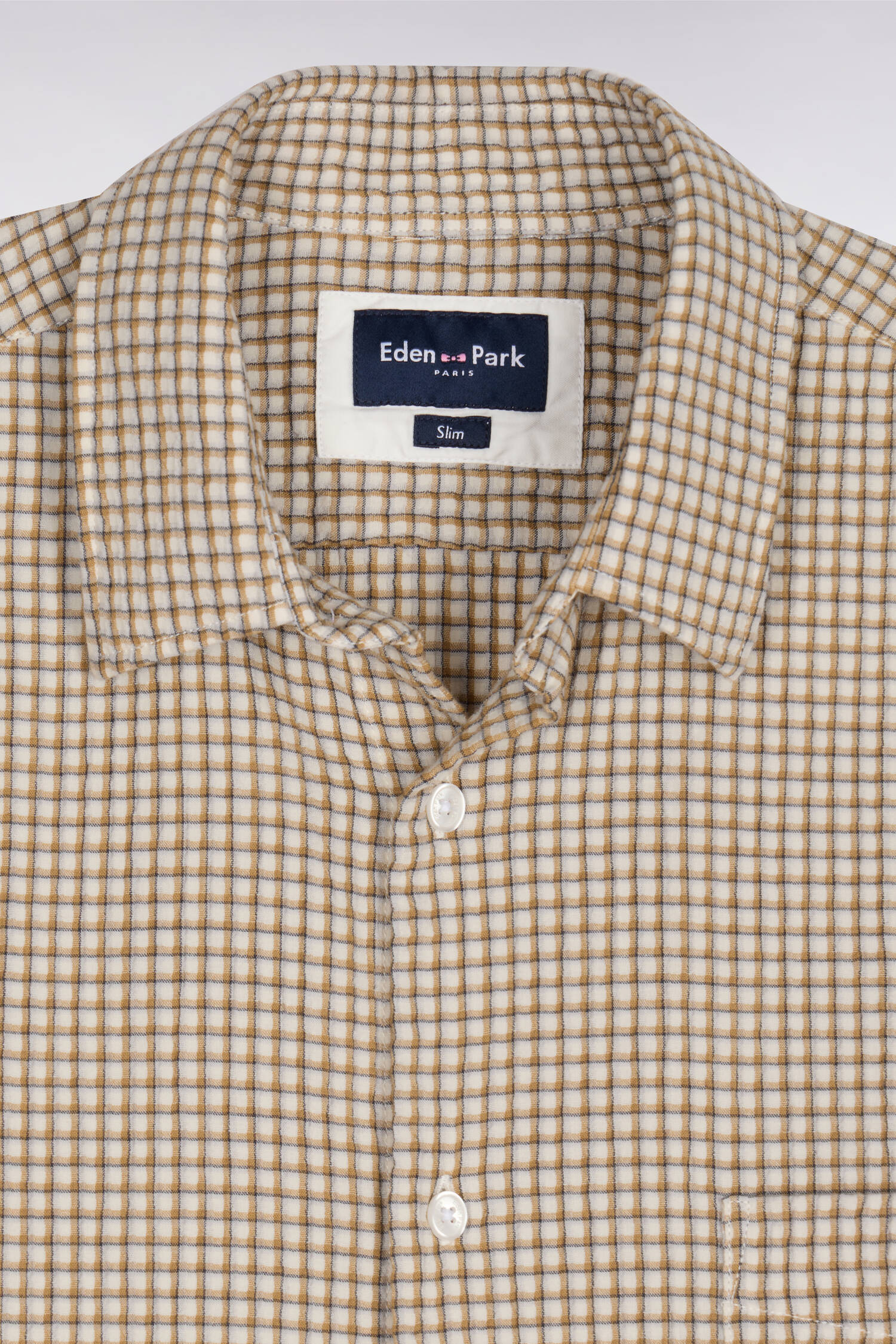Cette chemise à manches courtes en seersucker japonais revisite un classique du vestiaire estival avec raffinement et décontraction. Son tissage à carreaux légèrement gaufré assure légèreté et respirabilité, tout en limitant le froissement. Avec sa coupe slim plus ajustée et ses finitions soignées, comme sa poche poitrine brodée du nœud papillon rose Eden Park et son bas de pièce net à pant droit, cette chemisette beige s’impose comme un essentiel chic et fonctionnel pour la saison printemps été. Associez la vôtre à un pantalon chino ou à un jean au délavage travaillé ainsi qu'à des mocassins ou une paire de baskets basses.