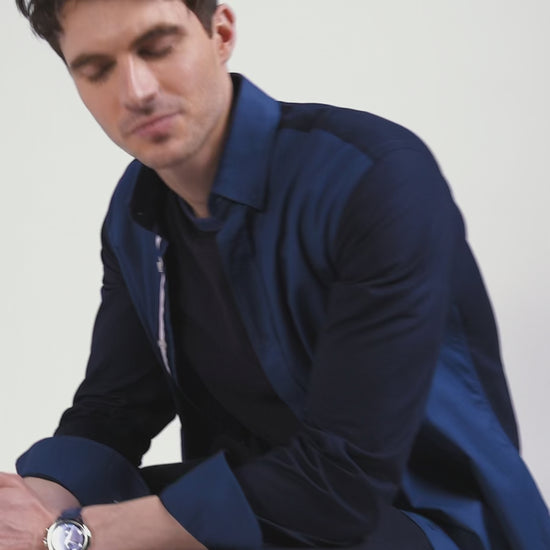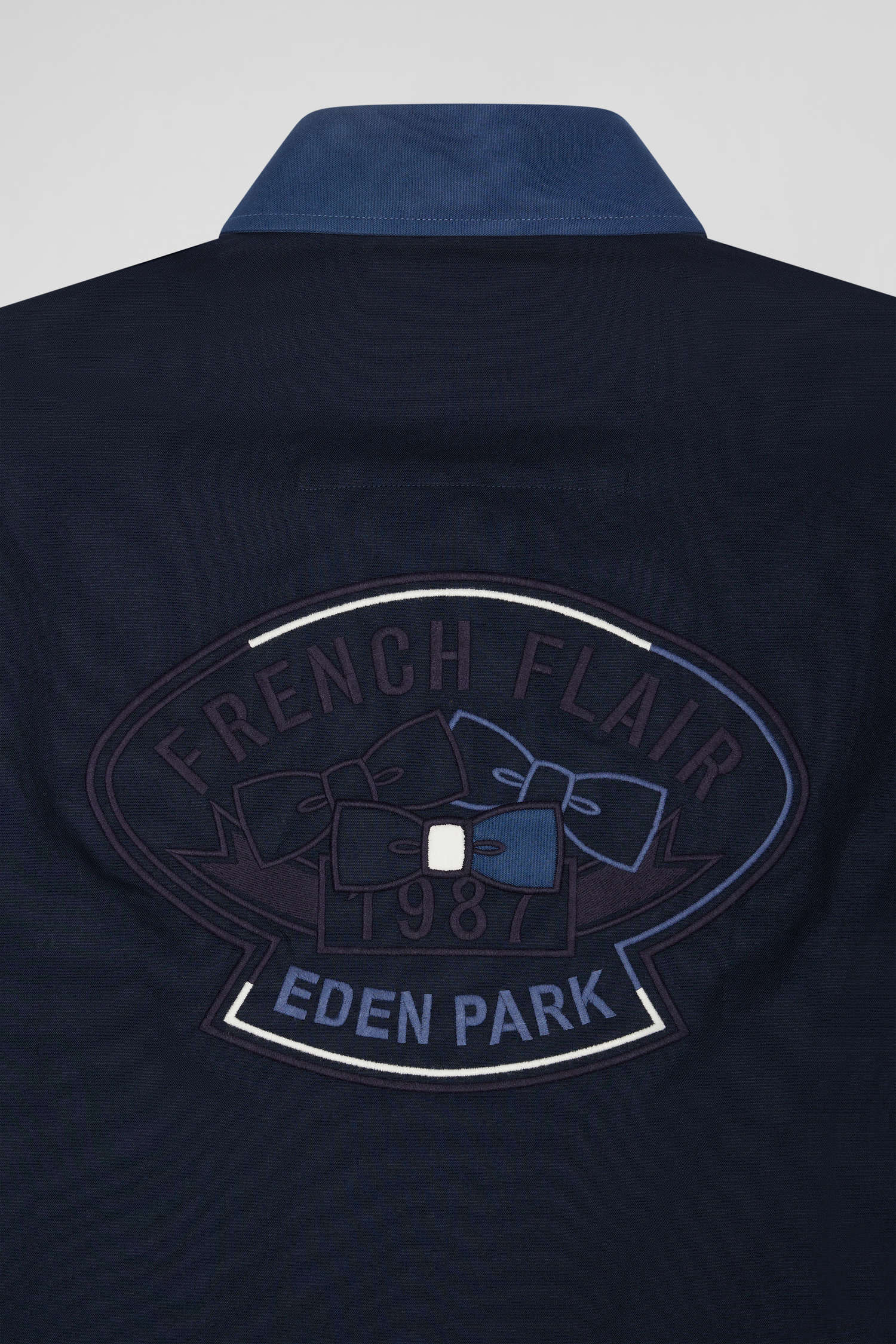 Pour cette chemise homme toute en nuances de bleu marine et bleu foncé, nous avons choisi un coton pin point, reconnu pour son tissage dense qui offre une texture plus prononcée et une robustesse supérieure à celle de la popeline, tout en assurant confort et liberté de mouvement. Le dos de la chemise se distingue par une broderie reflétant l'héritage sportif d'Eden Park. Les détails tricolores sur la patte de boutonnage, écho à la broderie du nœud papillon lui confèrent une élégance sportive, incarnant l'esprit French Flair.