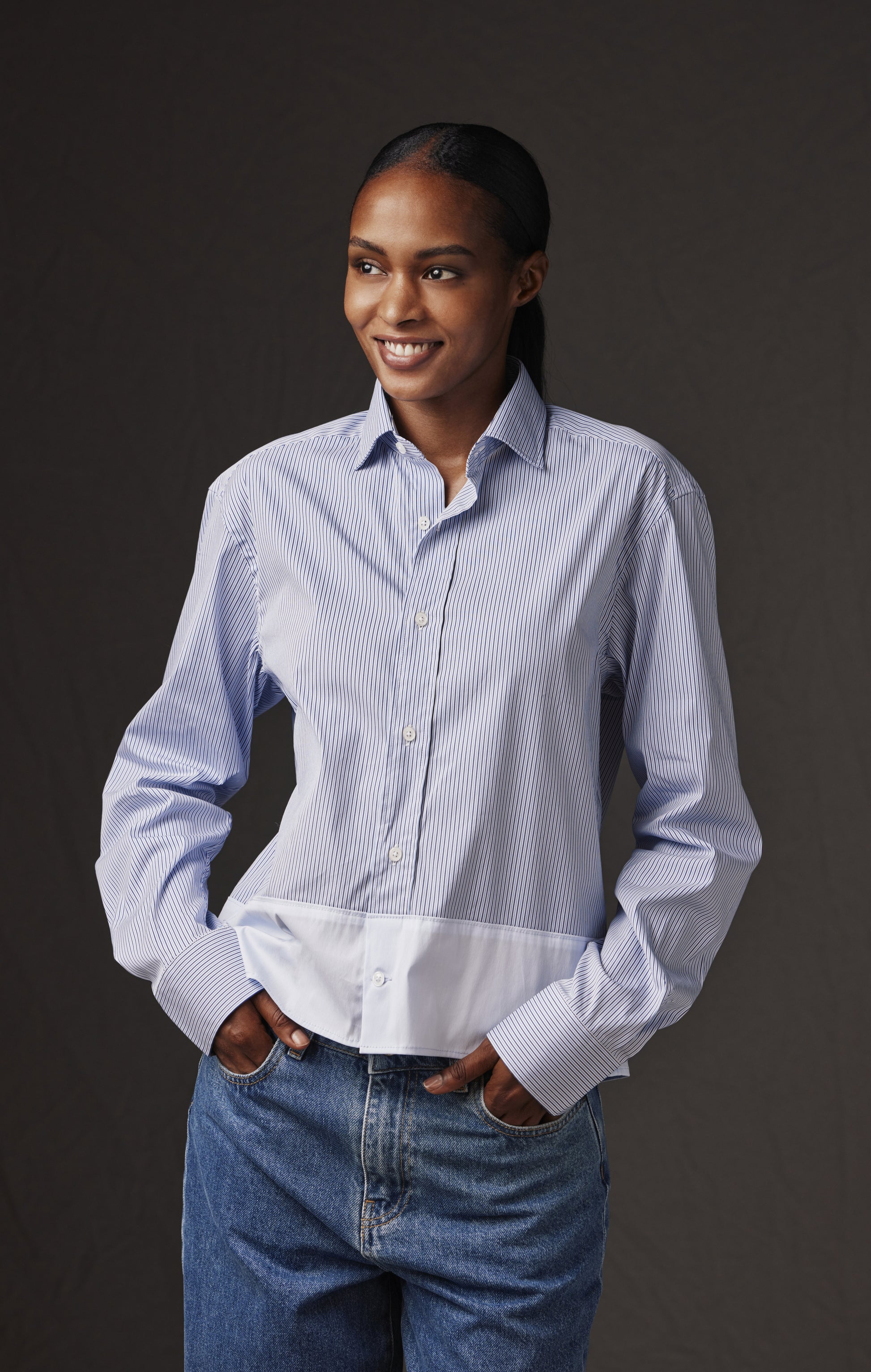 Assurez-vous d'un style personnel en portant cette pièce unique, créée par notre atelier en un seul exemplaire dans une taille médium (longueur 62cm). Pour cette élégante chemise femme, notre Maison a sélectionné une chemise rayée issus de nos archives masculines avant de la retravailler avec soin. Découpée, elle est ensuite complétée par l'ajout d'une bande de tissu prélevée sur une autre chemise provenant de nos stocks dormants. L'association des rayures bleues et blanches et le montage en patchwork prête à cette chemise femme une allure graphique idéale pour structurer la silhouette féminine. Jeans ou pantalons tailoring à taille montée se marieront à merveille à cette chemise upcyclée. La capsule Pap'Atelier est exclusivement proposée sur notre site pour une durée limitée.