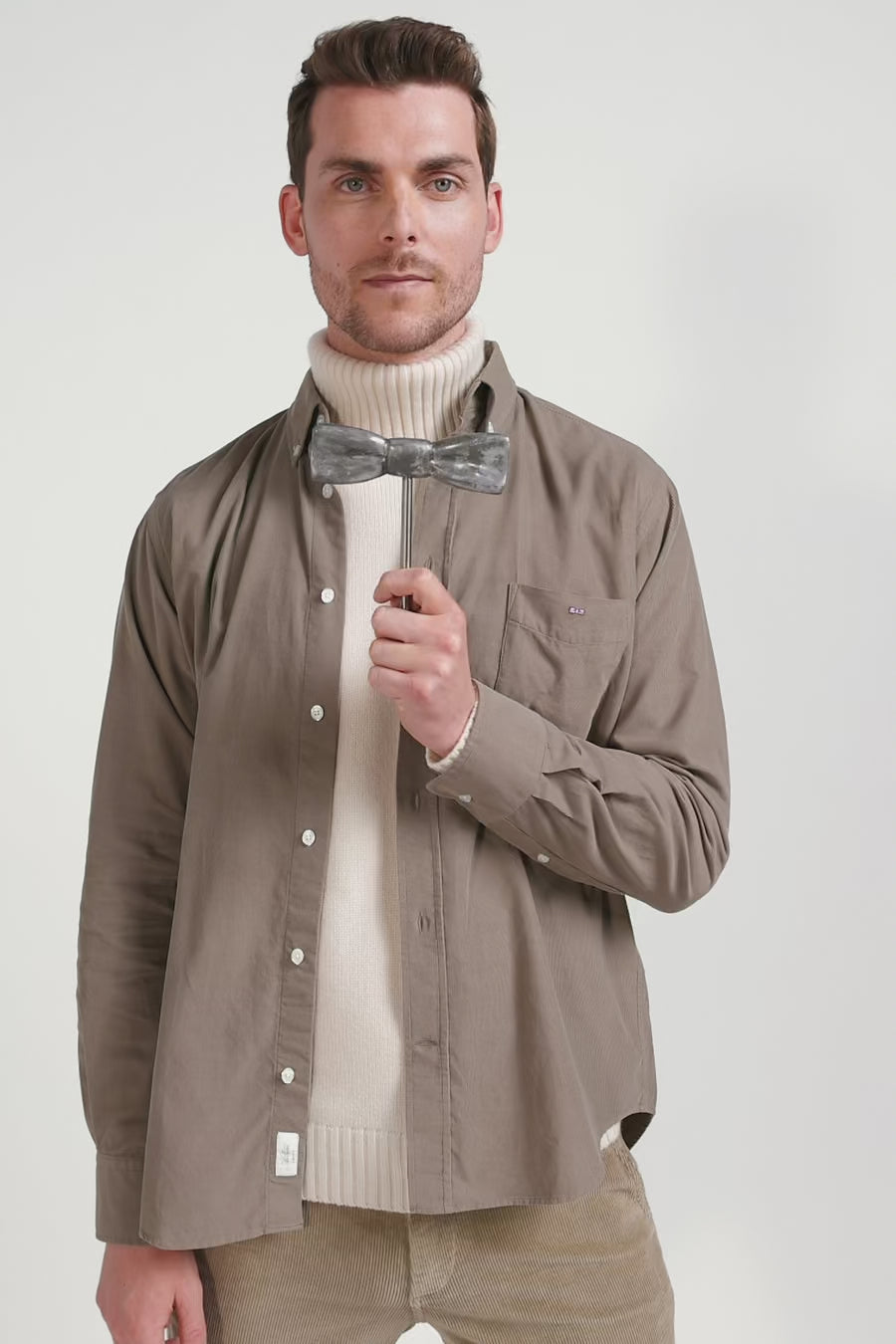 Chemise en velours côtelé uni beige col boutonné et poche poitrine coupe Regular