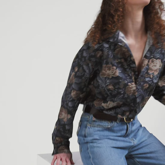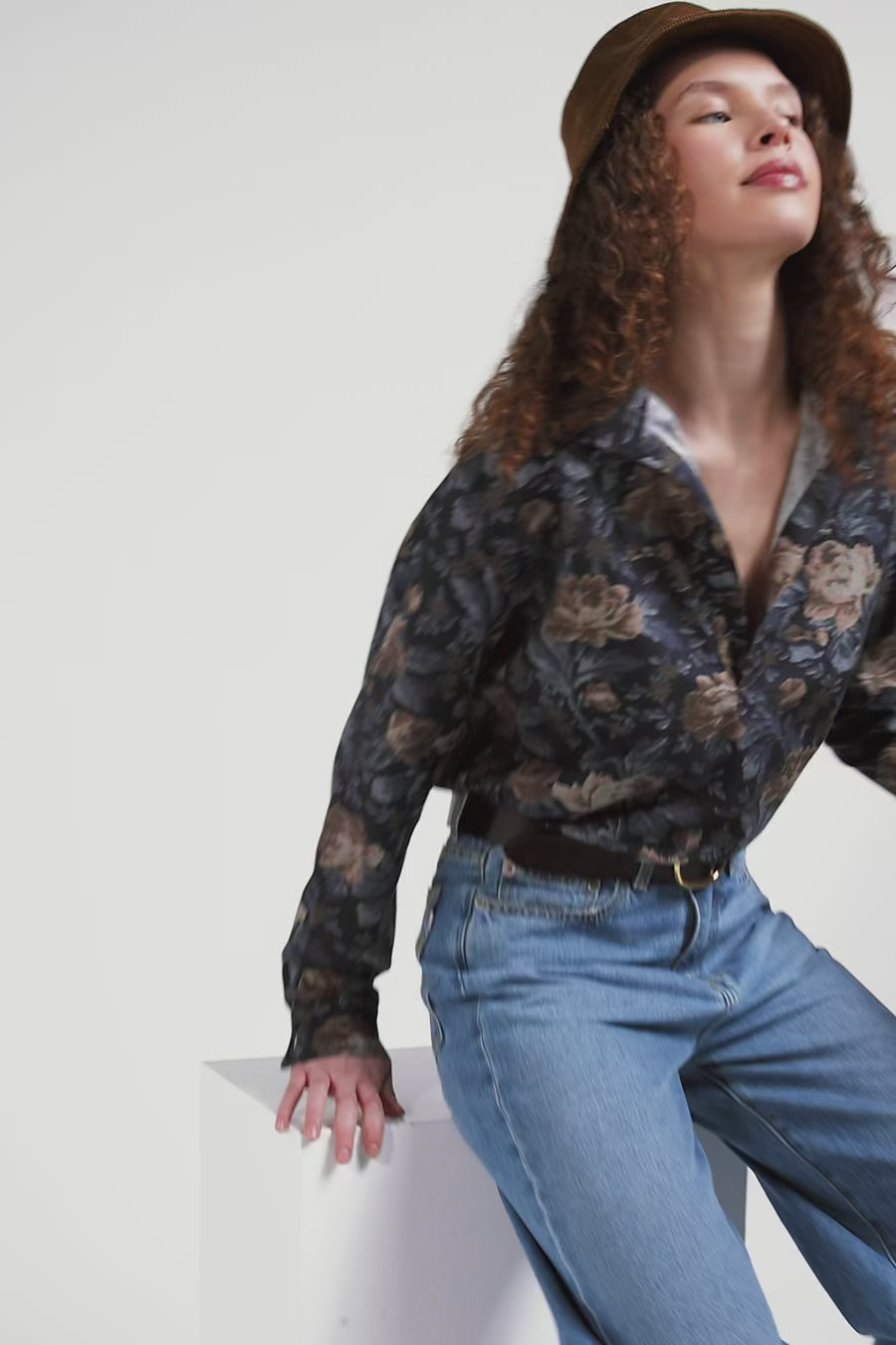 Chemise en flanelle de coton bleu marine imprimé floral coupe Relaxed