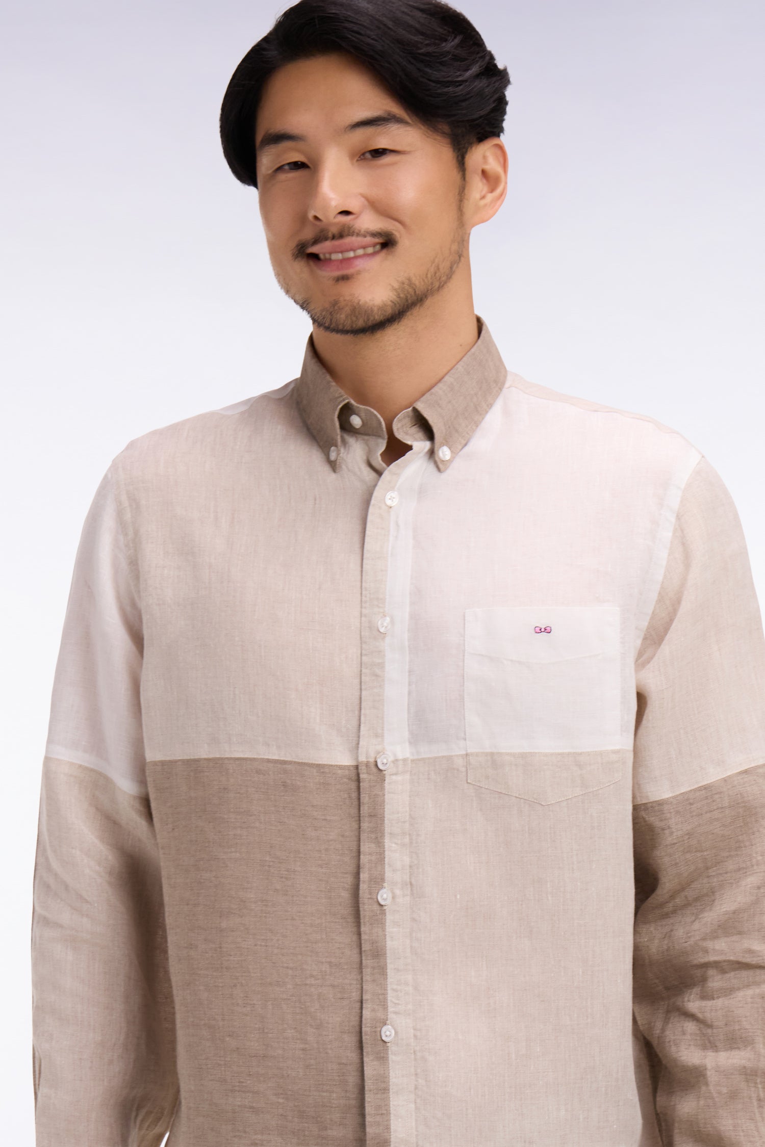 Avec ses panneaux contrastés inspirés des cadrans des maillots de rugby travaillés en coupé-cousue cette chemise homme réalisée dans un camaïeu beige affirme son appartenance au vestiaire Eden Park. Sa coupe regular assure une aisance naturelle, tandis que le lin apporte une légèreté idéale pour la saison.
