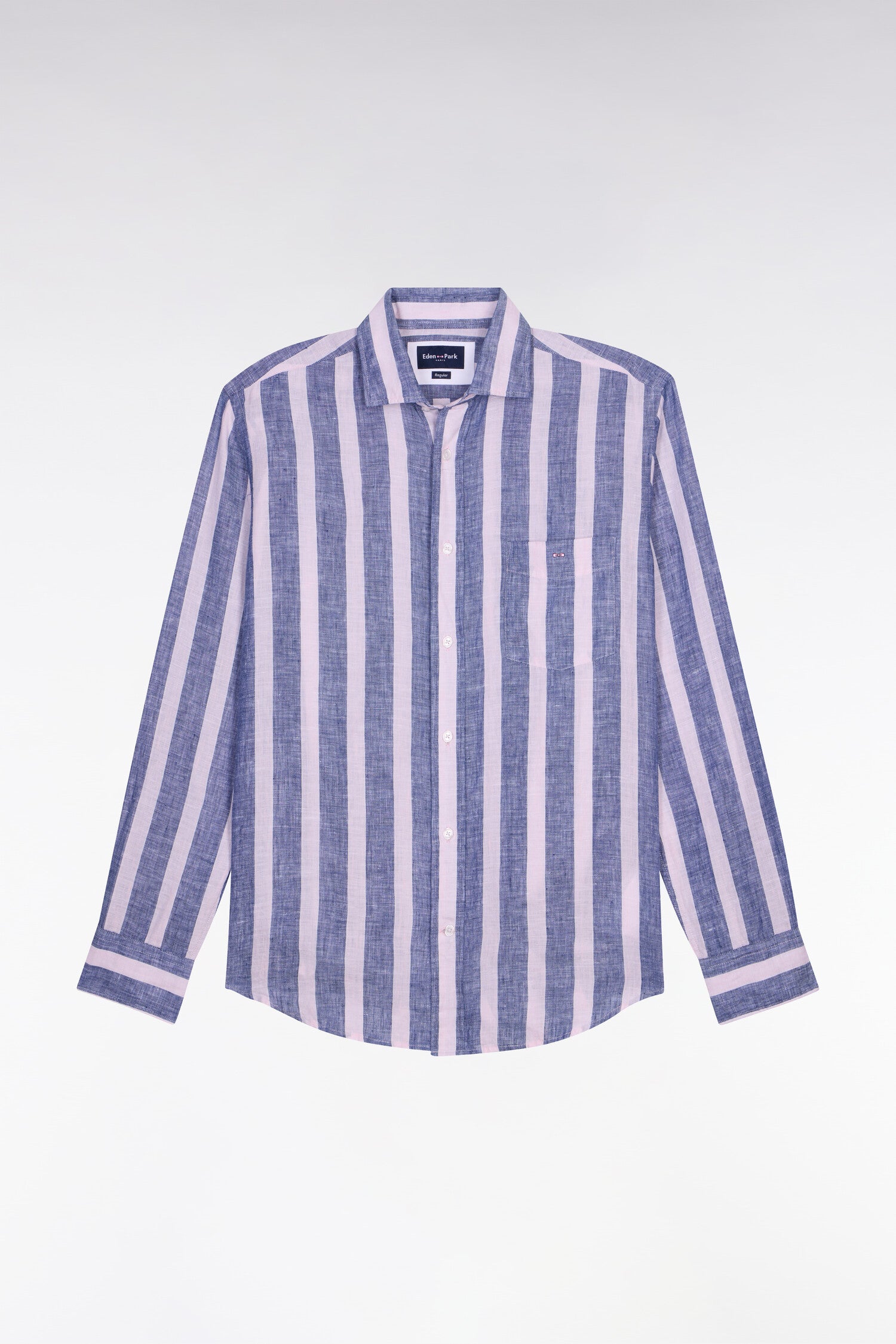 Cette chemise en lin pur décline les rayures bâton dans une version estivale bicolore. Légère, respirante et naturellement texturée, elle offre un confort idéal pour accompagner les journées chaudes. Sa coupe droite et son col à pointes libres structurent la silhouette tout en préservant votre confort. Les deux plis au dos apportent une aisance supplémentaire, tandis que la poche poitrine ornée de l’emblématique nœud papillon rappelle subtilement l’identité de notre Maison française. Ses finitions soignées traduisent l’exigence de notre Maison et ses ateliers. Un essentiel du vestiaire sport chic masculin à associer à un chino clair ou un jean brut en toutes circonstances.