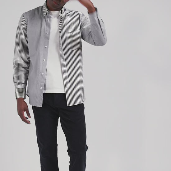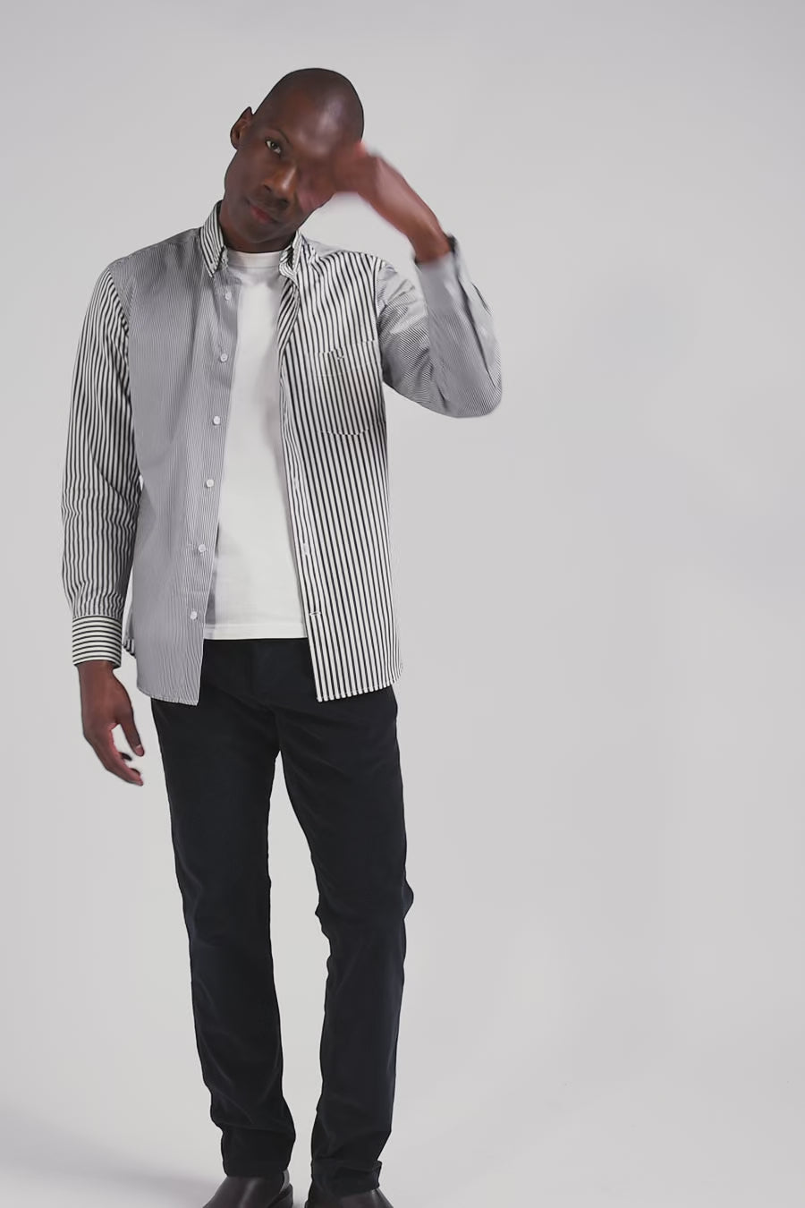 Notre chemise en popeline de coton est audacieusement conçue avec un mix and match de trois types de rayures pour un look dynamique et moderne. Ce modèle présente un col à pointes boutonnées et un pli au dos qui accentue sa coupe droite, offrant une silhouette élégante. Une broderie discrète nœud papillon orne la poche poitrine, ajoutant une touche de raffinement à cette chemise pour homme. Parfaite pour le bureau ou les occasions spéciales, cette chemise combine créativité et confort.