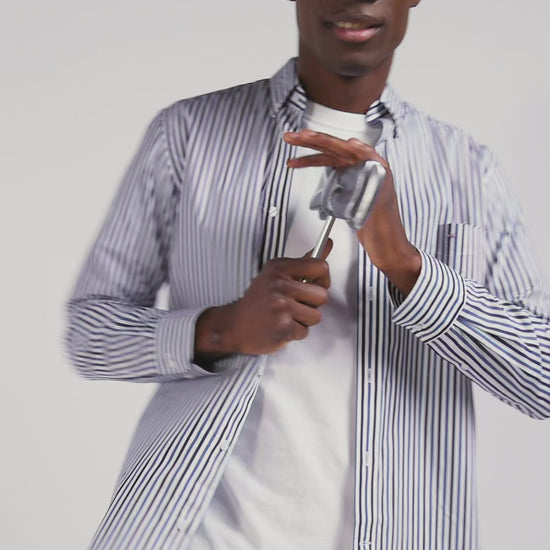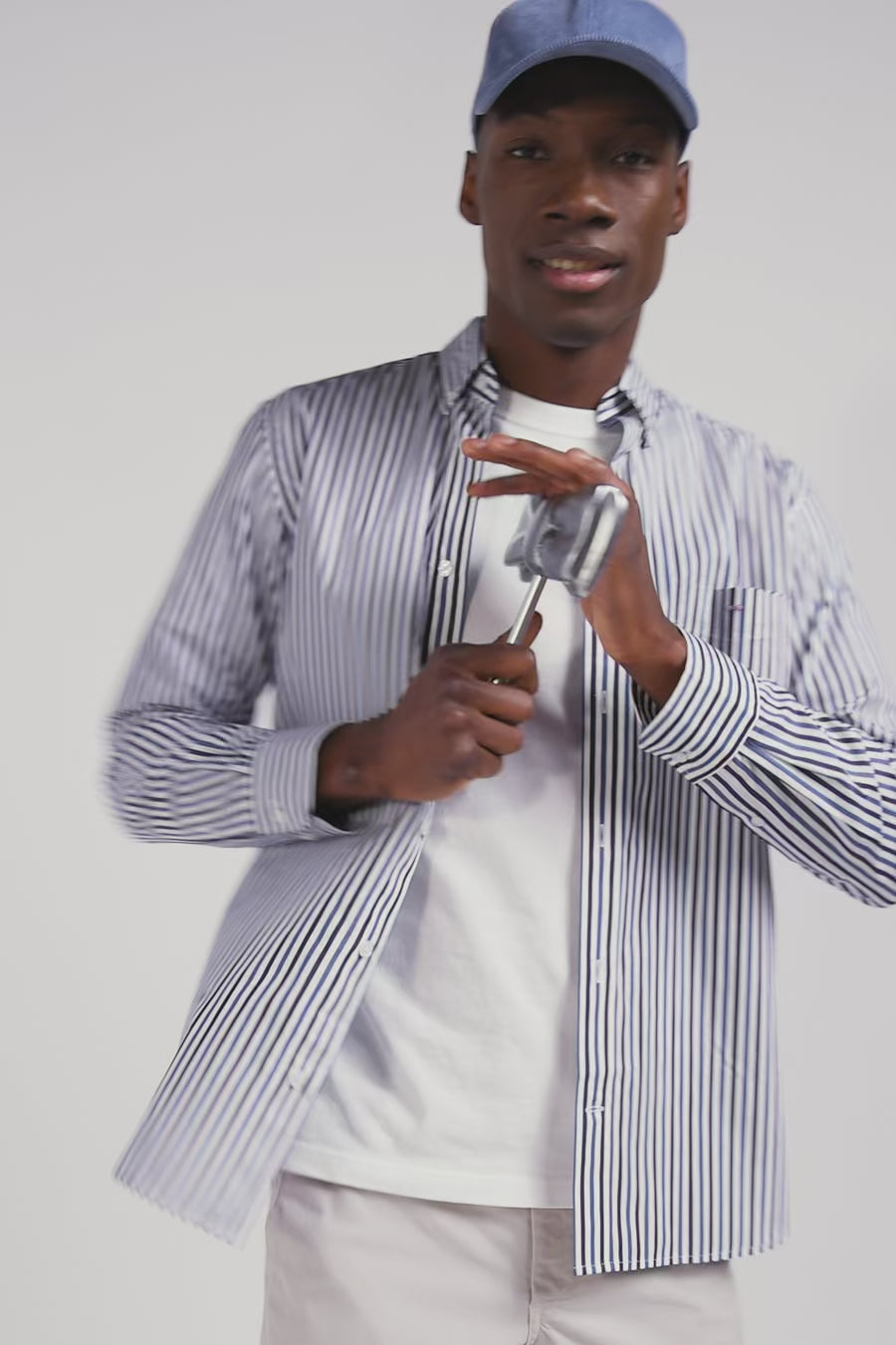 Notre chemise en popeline de coton rayée est conçue pour s'adapter à toutes les silhouettes grâce à sa coupe Regular droite. Ses rayures bâtons bicolores ajouteront une touche de dynamisme à votre tenue. Le col à pointes boutonnées assure un maintien impeccable, tandis que son pli au dos vous permet de bénéficier d'une aisance supplémentaire. Sa broderie nœud papillon sur la poche poitrine signe cette chemise homme d'une touche d'élégance subtile. Ce classique revisité avec modernité est décliné pour la saison dans une large palette de couleurs et s'associe aussi bien à nos pantalons coupe chino qu'à un jean droit.
