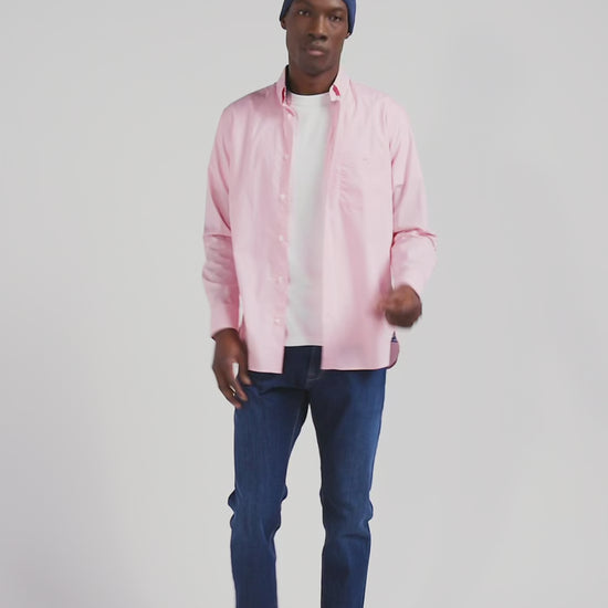 Chemise en popeline de coton rose col boutonné et coudières imprimées coupe Regular