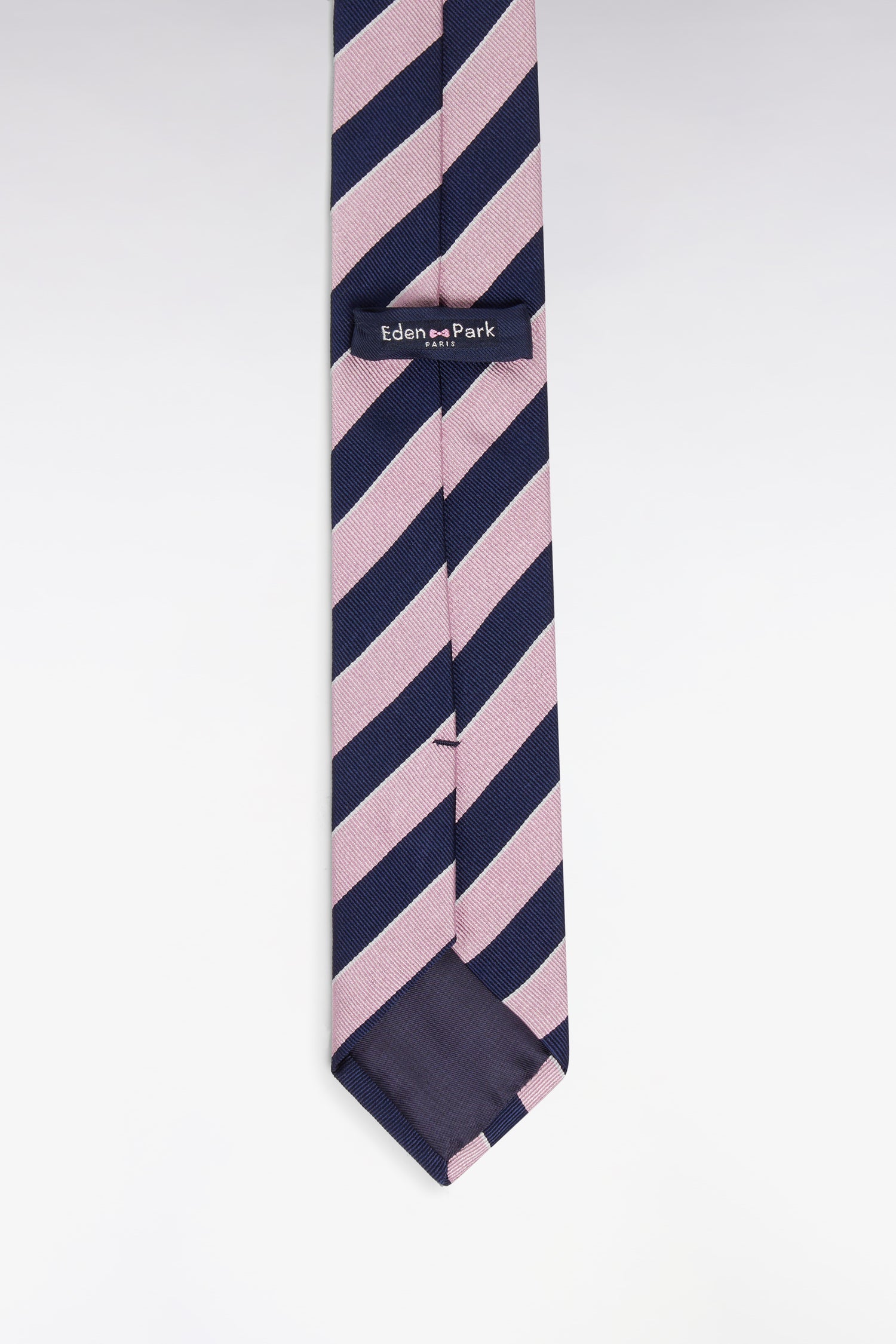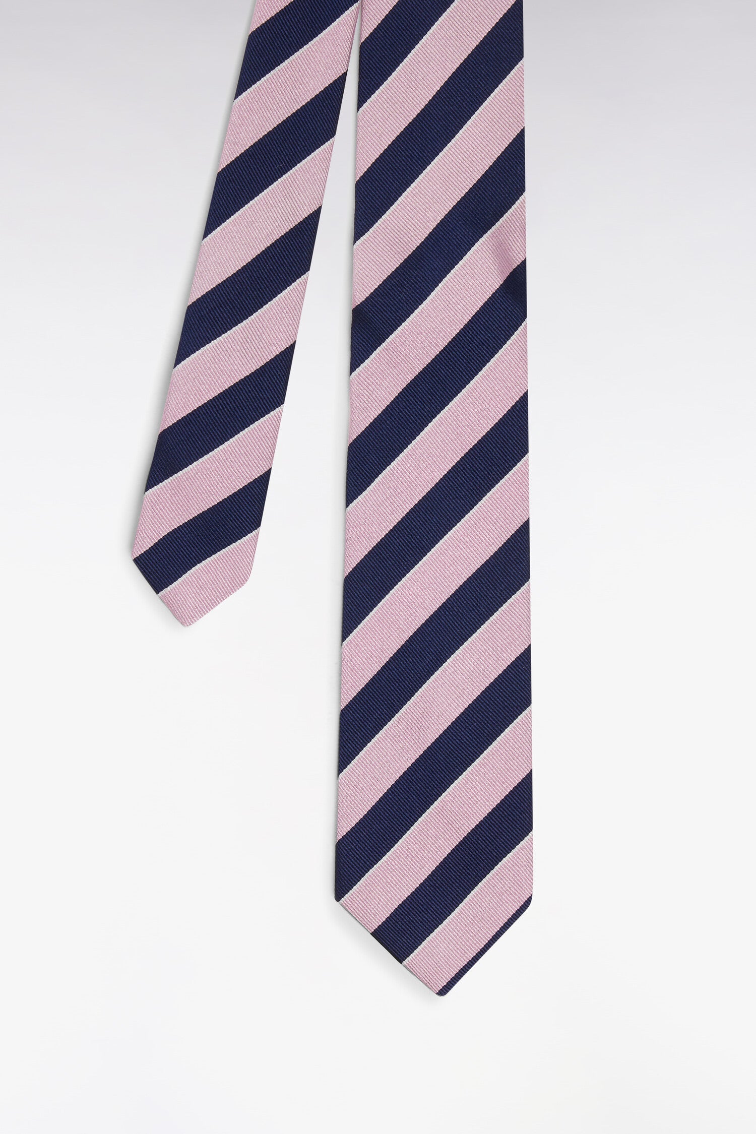 Cette cravate large en soie pure, marine et rose, se distingue par ses larges rayures bicolores, inspirées des maillots de rugby, un code emblématique de la Maison. Un accessoire élégant et sportif, parfait pour apporter du caractère à toute silhouette masculine. Portez-la sur une chemise à col libre sous une de nos vestes de blazer marine.