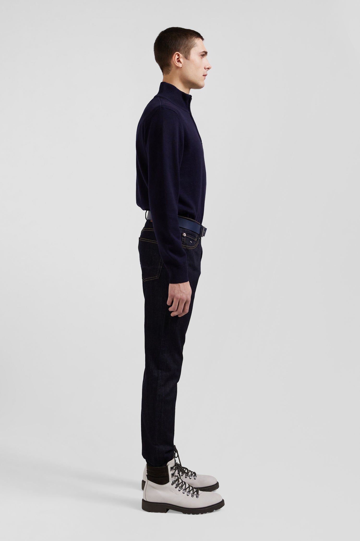 Ce jean 5 poches à la coupe Regular droite en denim brut combine élégance et simplicité. Idéal en toutes circonstances, ce jean bleu adopte nos finitions signature emblématiques du savoir-faire denim de notre marque française et des surpiqûres contrastées couleur tabac pour une allure authentique.