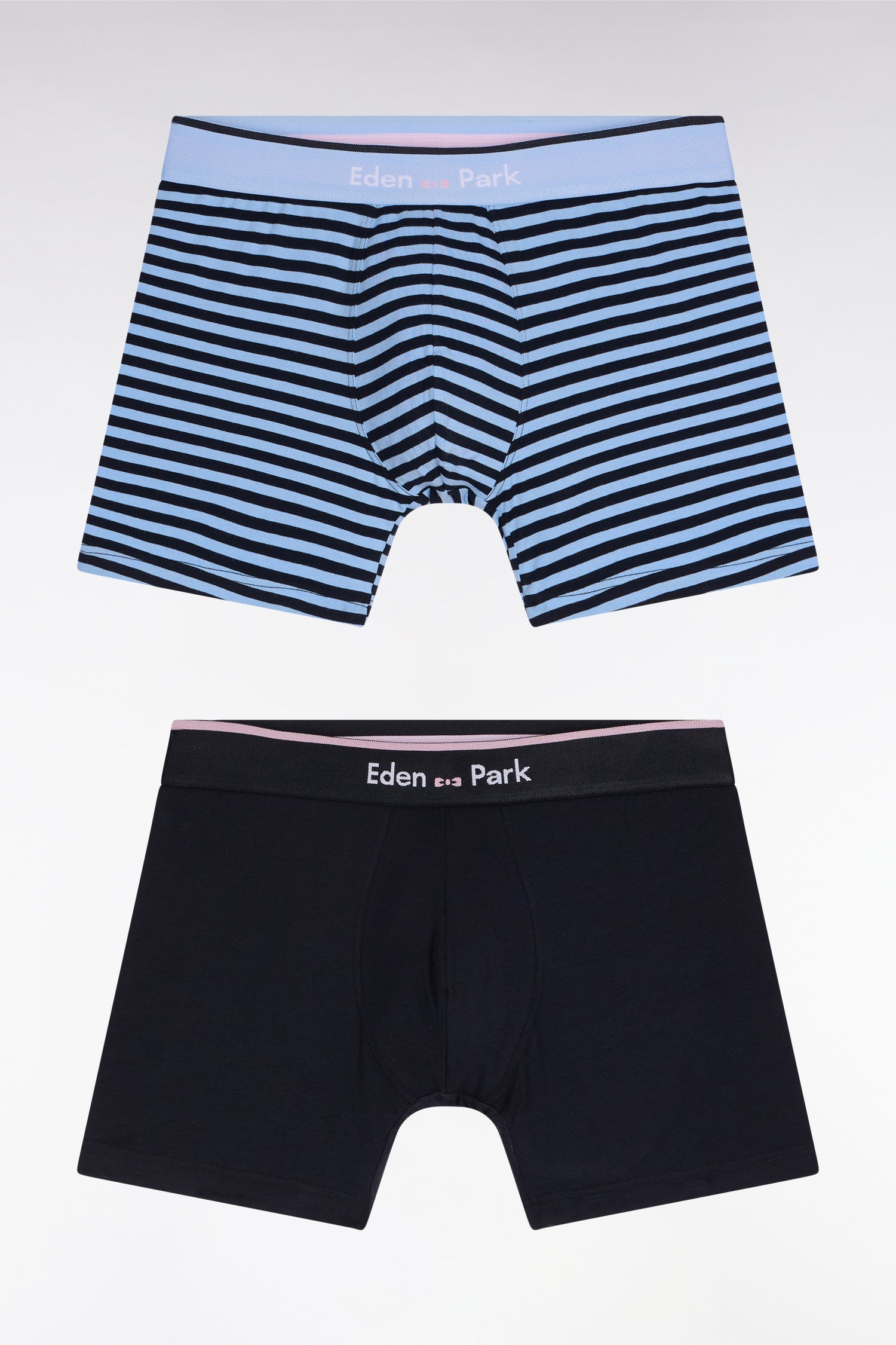 Ce lot de sous-vêtements masculins réunit deux boxers en jersey de coton stretch : un modèle marine uni et un second se distinguant par ses fines rayures dans une série de couleurs iconiques aux choix