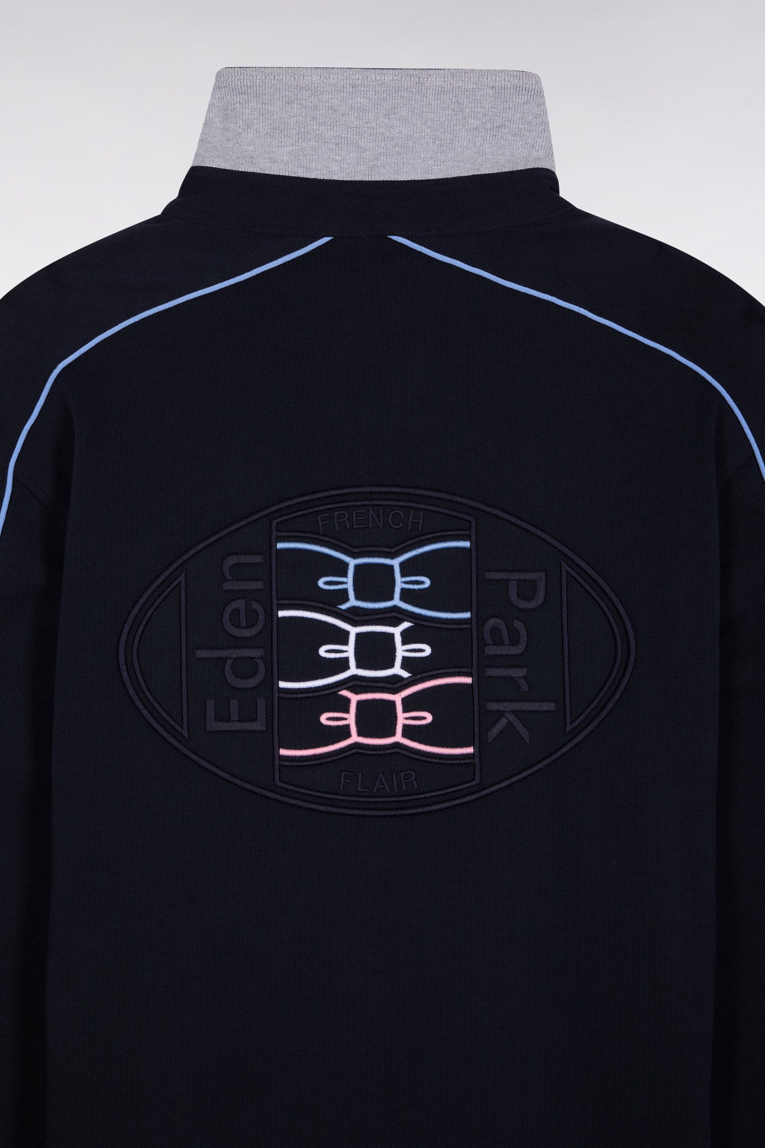 Craquez pour ce maillot de rugby sport-chic en jersey de coton épais. Ce modèle manches longues affirme son caractère avec sa broderie dos aux contour en relief, soulignée de passepoils colorés pour une touche graphique. Le col associe twill et maille bord-côtes grise pour plus de structure, tandis que les poignets resserrés assurent confort et maintien. Une pièce forte, fidèle à l’ADN sport-chic de la Maison offerte en deux coloris intemporels